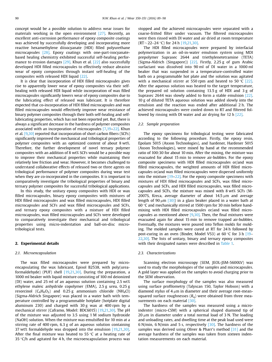 根据以下步骤制造用于摩擦测试的环氧树脂样品。首先,将环氧树脂Epolam 5015(Axson Technologies)和硬化剂Hardener 5015(Axson Technologies)以100:30的推荐比例掺入混合约10分钟。混合后,将混合物抽离约15分钟以除去气泡。对于HDI填充的微胶囊和蜡填充的微胶囊的环氧树脂复合材料试样,HDI填充的微胶囊和蜡填充的微胶囊的加权量均匀分散到混合物中[19-22]。对于混合有HDI填充微胶囊和SCFs,填充蜡的微胶囊和SCFs以及HDI填充微胶囊,填充蜡微胶囊和SCFs的环氧复合材料样品,将混合物与8wt%SCFs(M-2007S,Kreca ,平均直径约14.5毫米,平均长度90毫米[30])置于60℃水浴中的玻璃烧杯中,并在1500rpm下机械搅拌30分钟,然后与HDI填充的微胶囊掺入混合或/和如上所述的蜡填充微胶囊[9,30]。然后,再次将最后的混合物抽空约15分钟以除去残留的气泡。最后,将混合物倒入模具中进行成型。将模塑样品在常温下固化24小时,然后在烘箱(Binder,V53型)中在60℃下固化3小时[19-22,30]。表1中描述了具有其指定名称的一元,二元和三元环氧树脂复合材料的列表。