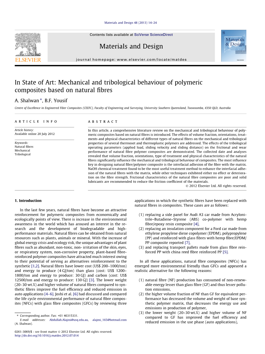 摘要:这篇文献综述介绍了天然纤维聚合复合材料的力学性能和摩擦性能。这里讨论了不同种类天然纤维材料的的体积分数、取向、处理方式和物理特性对数种热固性和热塑性聚合物的力学性能和摩擦学性能的影响并研究了摩擦学参数(载荷、滑动速度和滑动距离)对天然纤维聚合物复合材料摩擦磨损性能的影响。收集的数据和分析表明,天然纤维的体积分数、取向、处理方式和物理特性对复合材料的力学性能和摩擦学性能有显著的影响。纤维与基体的界面粘结是天然纤维/聚合物复合材料设计中最重要的影响因素。NaOH化学处理方式是提高与基体的天然纤维的界面粘合的最有效的处理方法,同时并没有影响或损坏的纤维强度。天然纤维复合材料的摩擦性能较差,建议采用固体润滑剂来降低材料的摩擦系数。