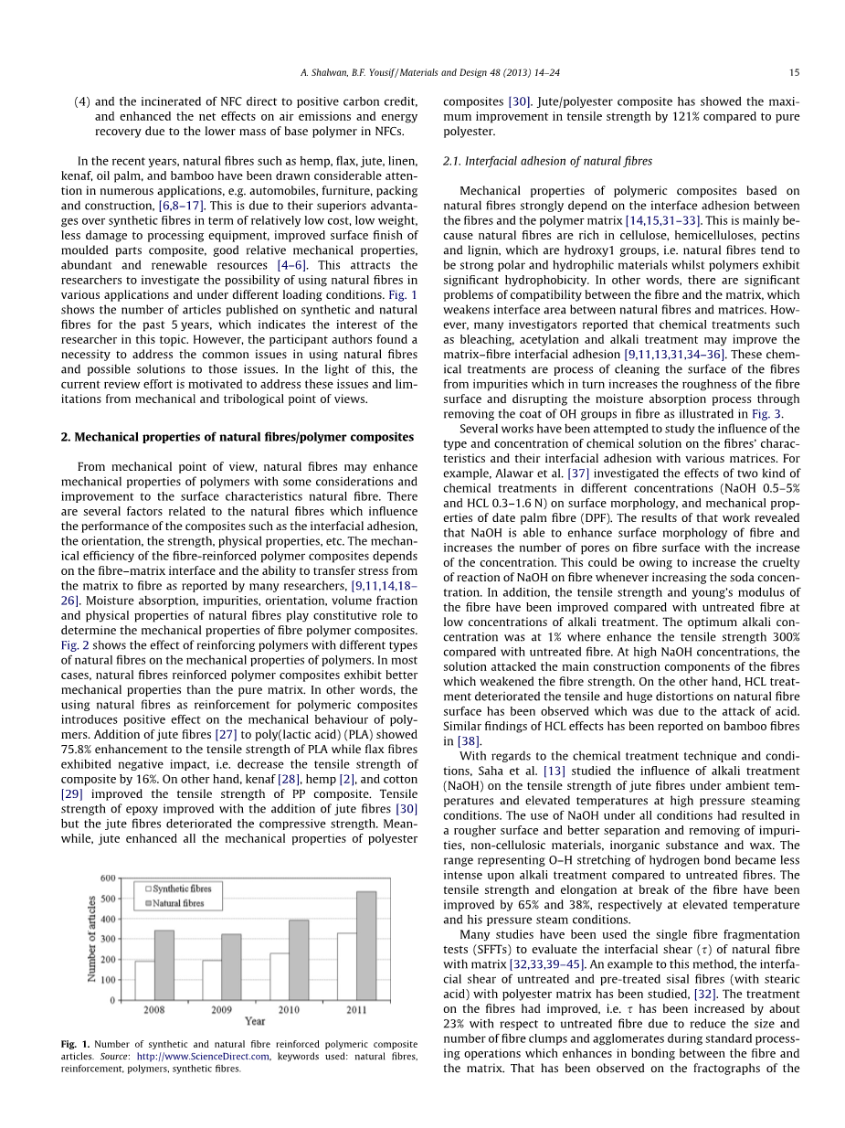 近年来,天然纤维如大麻、亚麻、黄麻、亚麻、红麻、油棕榈和竹子等,在许多方面得到了广泛的应用,例如:如汽车、家具、包装和建筑,[6,8-17]。这是因为他们在成本相对较低、重量较轻、对加工设备的损坏较小等方面优于合成纤维,改善模塑件复合材料的表面光洁度,具有良好的相对机械性能,丰富的可再生资源[4–6]。他的研究吸引了研究人员研究在不同的应用和不同的负载条件下使用天然纤维的可能性。图表1显示了过去5年发表的关于合成纤维和天然纤维的文章数量,这表明了研究者对这一课题的兴趣。然而,参与者认为有必要解决使用天然纤维的共同问题以及得到解决这些问题的可能办法。有鉴于此,当前的审查工作是旨在从机械和摩擦学的角度来解决这些问题。