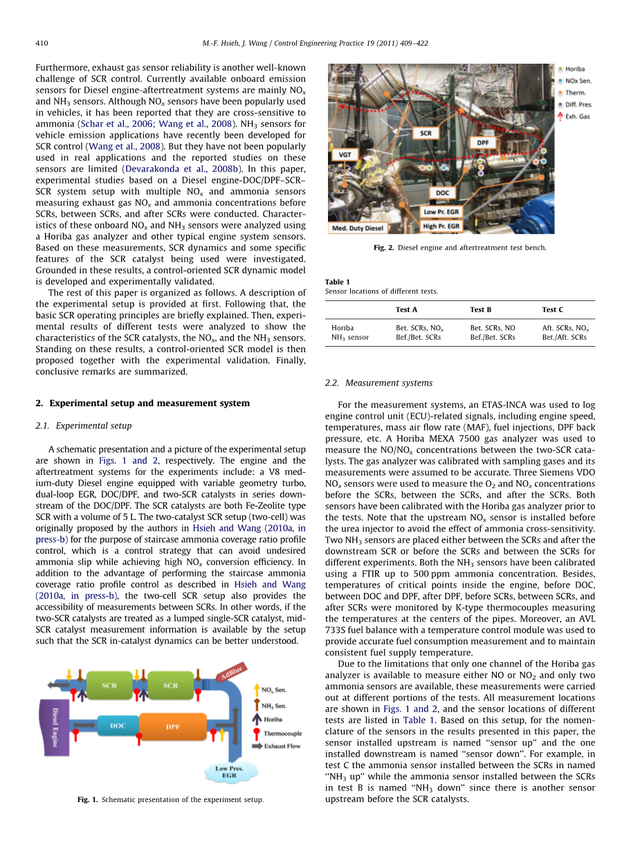 图1和图2分别展示了实验装置的示意图。用于实验的发动机和后处理系统包括:装有可变几何涡轮增压器的V8中型柴油发动机,双环EGR,DOC / DPF和两个SCR催化剂在串联下游的DOC / DPF。SCR催化剂都是体积为5L的Fe-沸石型SCR。双催化剂SCR装置(两室)最初由作者Hsieh and Wang提出以达到楼梯氨气覆盖率比例控制,这是一种控制策略,可以避免不必要的氨气滑移,同时实现高NOX转换效率。除了执行如上所述的阶梯式氨覆盖率比例控制的优点之外,双电池SCR设置还提供了SCR之间测量的可访问性。换句话说,如果将双SCR催化剂作为集中式单SCR催化剂处理,则通过设置可获得中SCR催化剂测量信息,从而可以更好地理解SCR催化剂动力学。