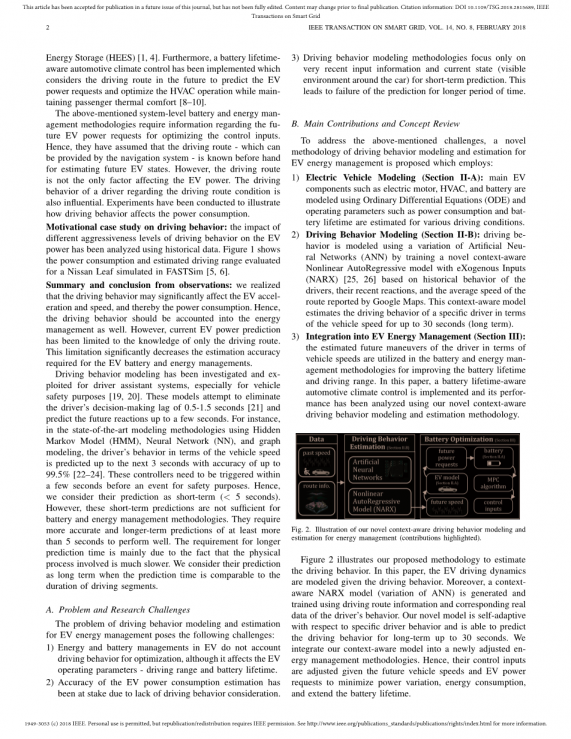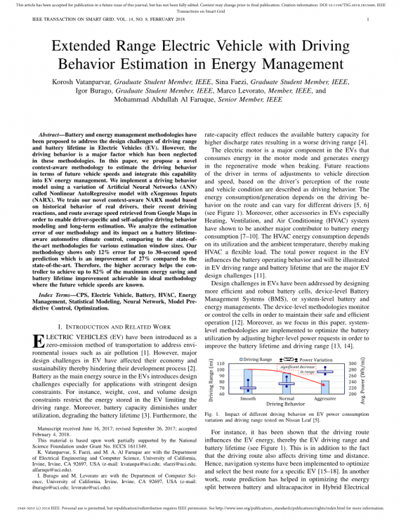 摘要:电池和能源管理方法已被提出用于解决电动汽车(EV)的行驶里程和电池寿命的设计挑战。然而,驾驶行为是这些方法中忽略的主要因素。在本文中,我们提出了一种新颖的估算方法,用于估计未来车辆速度方面的驾驶行为,并将此功能集成到电动汽车能源管理中。我们使用人工神经网络(ANN)的变体实现驾驶行为模型,称为具有外源输入的非线性自回归模型(NARX)。我们根据驾驶员真实的历史行为和他们最近的驾驶反应以及从谷歌地图中获得的路线平均速度来实验我们新颖的估算NARX模型,以实现特定驾驶员和自适应驾驶行为建模和长期估计。我们分析了我们的方法的估计误差及其对电池寿命关于汽车温度控制的影响,与各种最新估算方法相比较。我们的方法显示,对于长达30秒的速度预测,仅有12%的误差,与现有技术相比,这一方法改进了27%。因此,更高的精度有助于控制器在未来车速已知的理想条件下实现高达82%的最大能源节约和电池寿命改善。
