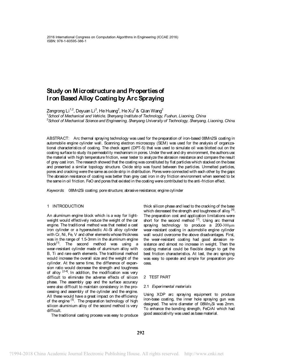 关键词:08Mn2Si涂层; 孔结构; 耐磨性; 发动机气缸。