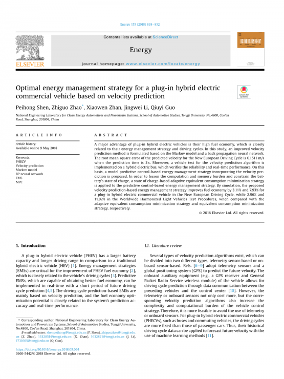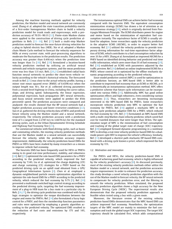 对于固定行驶周期的商用车,如公交车、通勤车辆,现有的速度预测方法采用马尔可夫模型或神经网络可以成功预测速度,但预测精度有待提高。此外,基于速度预测的插电式混合动力汽车(PHEV)或混合动力汽车(HEV)的EMS作为一种提高汽车燃油经济性的手段已经被许多研究人员所研究。