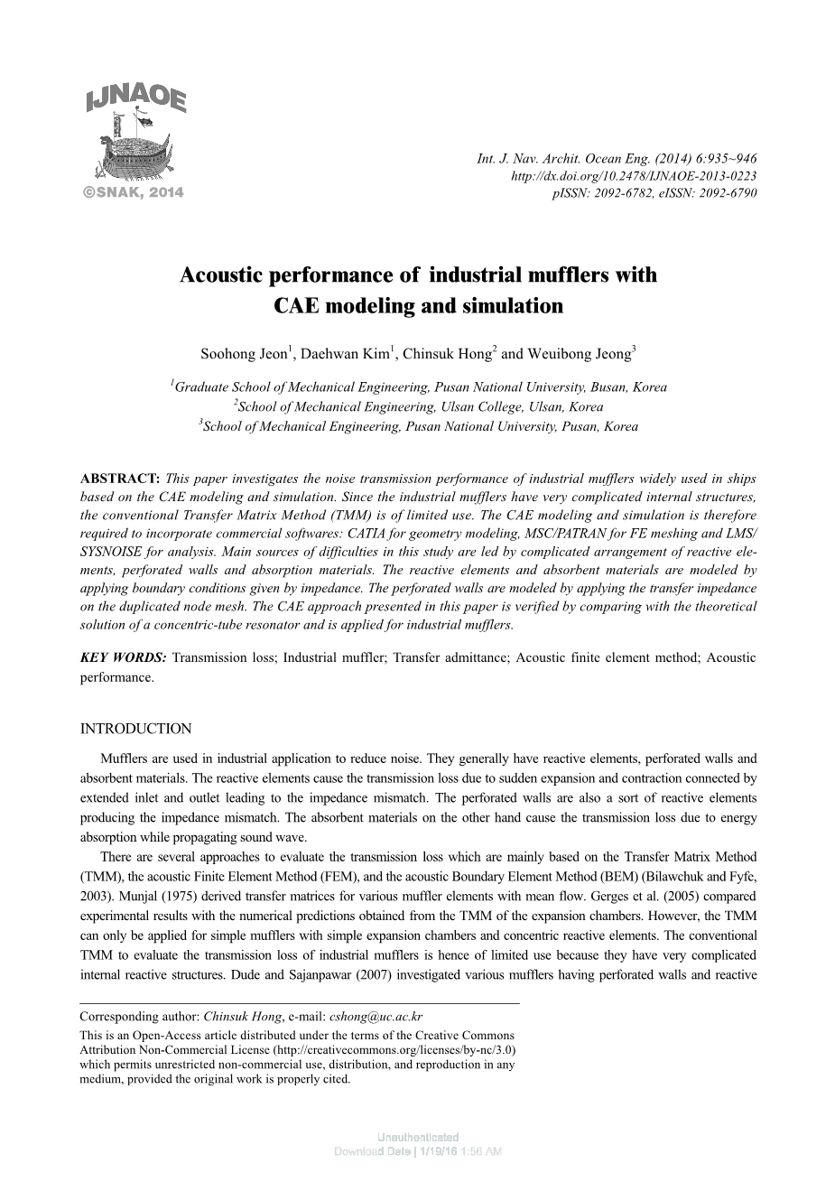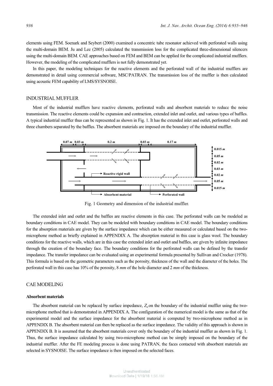 摘要:本文研究了船舶广泛使用的工业消声器的噪声传播性能基于CAE建模和仿真。 由于工业消音器内部结构非常复杂,常规的传输矩阵法(TMM)的使用有限。 因此,CAE建模和仿真需要结合商业软件:用于几何建模的CATIA,用于FE网格的MSC / PATRAN和LMS /SYSNOISE进行分析。本研究的主要困难来源于复杂的无功元素安排,穿孔墙和吸收材料。 反应元素和吸收材料由模型化应用阻抗给出的边界条件。 通过应用传递阻抗来对穿孔壁进行建模在重复的节点网格上。本文提出的CAE方法通过与理论比较来验证同心管谐振器的解决方案,适用于工业消声器。