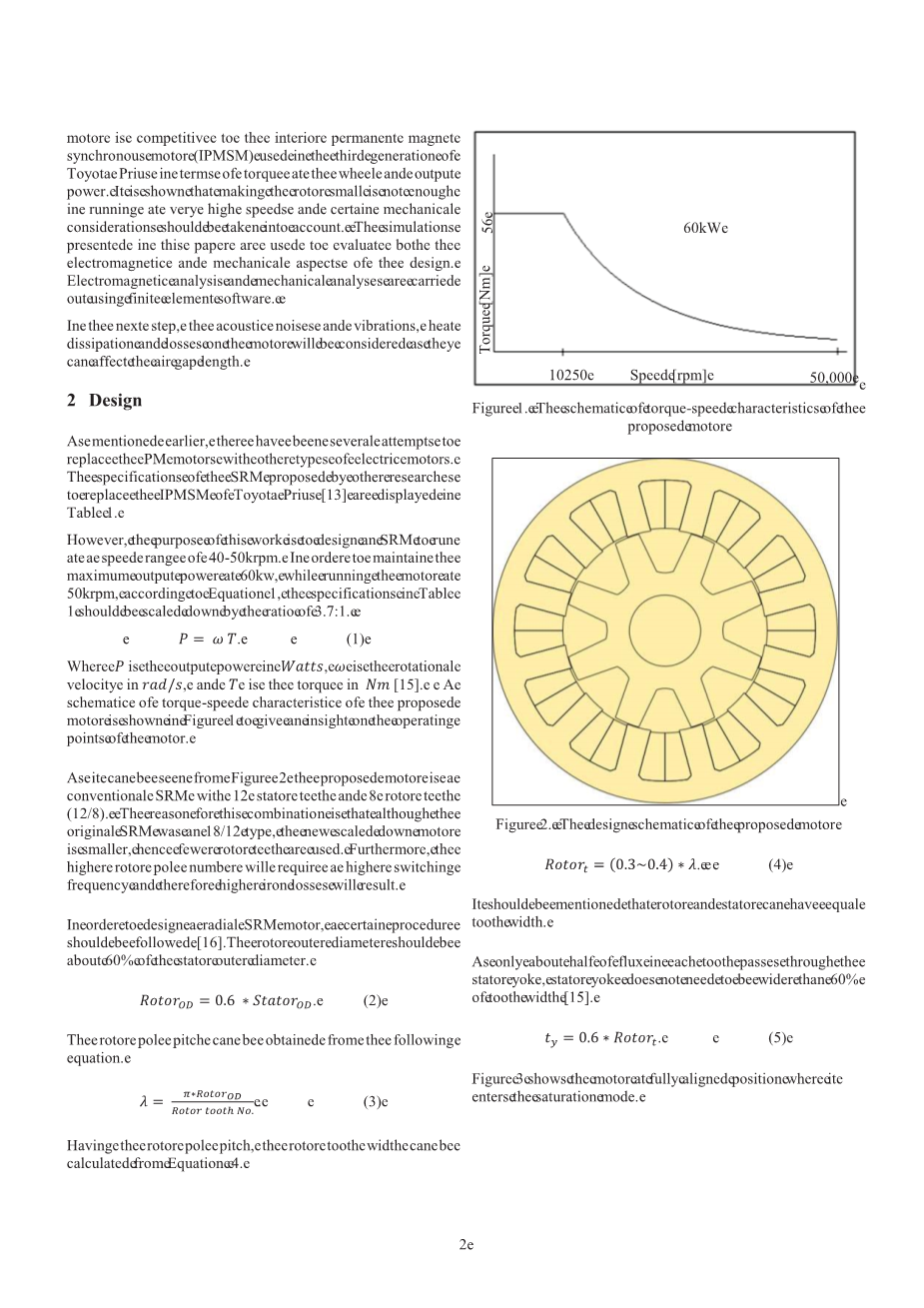 本文介绍了一种新型的SRM设计,可在40-50krpm的速度下运行。结果,所需的扭矩比具有相同输出功率以较低速度运行的等效电动机小得多,因此这种方法允许更小的框架尺寸。 SRM的这一特性,以及坚固性和低铜损等其他优势,使其成为未来汽车应用的合适研究领域,因为转子的简单结构是高速运行和使用脉冲控制SRM的理想选择。宽度波形,提供简单的控制方法[10]。然而,这种类型的电动机的设计,特别是在机械方面,需要仔细考虑,以便最小化作用在转子上的高机械应力。这些力是由于高速向心力和正常电磁力引起的高径向力[11,12]。在旋转物体中产生的向心力导致施加在物体上的径向和切向应力。转速越高,应力越大。应力集中在物体的任何尖角周围。而且,切向应力在轴周围最高。在高速运转时,电机的振动和固有频率需要精确注意,因为它们会影响声学噪声,轴承损耗和故障风险。由于固有频率与转子的长度直接相关,因此在高速操作中短轴是优选的。