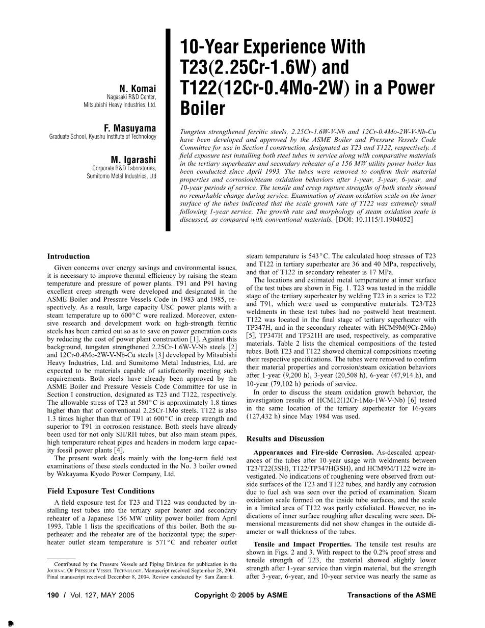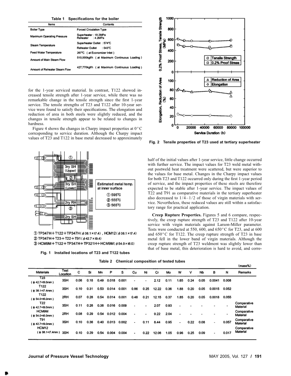 钨强化铁素体钢,2.25铬-1.6W-钒-铌和12Cr-0.4Mo-2W-钒-铌-铜已由美国机械工程师学会锅炉和压力容器规范委员会开发并批准用于第一节结构,分别命名为T23和T122。自1993年4月以来,在一台156兆瓦的电站锅炉的三级过热器和二级再热器中进行了现场暴露试验,试验中使用了两种钢管和对比材料。在使用1年、3年、6年和10年后,拆除管子以确认其材料特性和腐蚀/蒸汽氧化行为。两种钢的拉伸和蠕变断裂强度在使用过程中没有显著变化。对管子内表面蒸汽氧化皮的检查表明,T122使用一年后氧化皮的增长率极小。讨论了蒸汽氧化皮的生长速度和形貌,并与常规材料进行了比较。