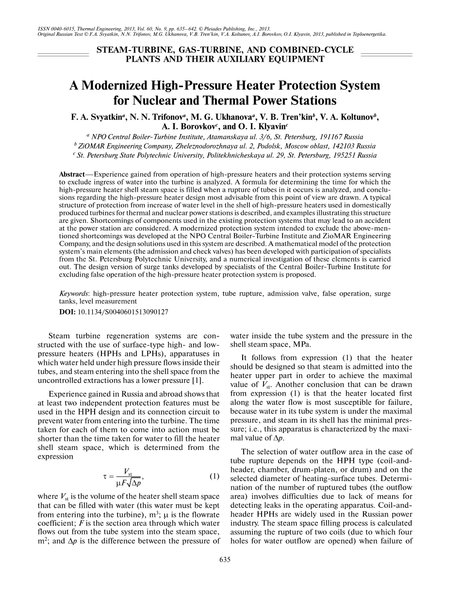 摘要:分析了高压加热器及其保护系统在防止水进入汽轮机方面的工作经验。 分析了高压加热器壳体蒸汽空间发生破裂时充入时间的计算公式,并从这个角度得出了高压加热器设计的结论。介绍了一种典型的热电站和核电站用国产汽轮机高压加热器外壳保护水位升高的结构,并举例说明了这种结构。考虑了现有保护系统中可能导致电站事故的部件的缺点。 在NPO中央锅炉涡轮研究所和ZioMAR工程公司开发了一种旨在排除上述缺陷的现代化保护系统,并描述了该系统中使用的设计解决方案。 在圣彼得堡理工大学专家的参与下,建立了一个保护系统主要要素(接纳和止回阀)的数学模型,并对这些要素进行了数值调查。 提出了中央锅炉-汽轮机研究所为排除高压加热器保护系统误操作而研制的调压箱设计方案。