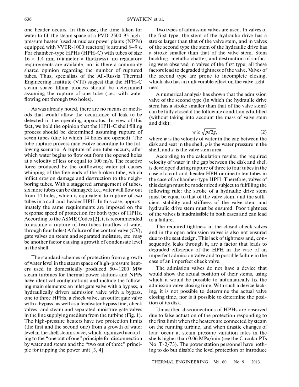 俄罗斯和国外的经验表明,在HPH设计及其连接电路中必须使用至少两个独立的保护功能,以防止水进入涡轮。它们每一个起作用所需的时间必须短于水填充加热器壳蒸汽空间所需的时间,这是由表达式决定的