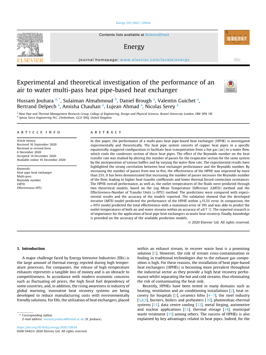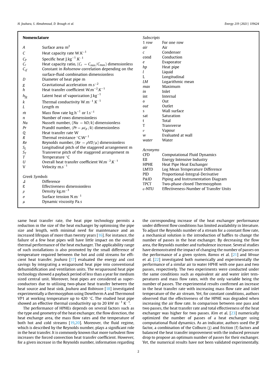 对于公司和工程师而言,系统性能的预测也很重要,并且需要估算给定安装的投资回报期。对于公司和EII的潜在投资者而言,准确的投资回报预测为了提高对换热器潜在投资的信心至关重要。要计算换热器的性能,通常使用两种技术:对数平均温度差(LMTD)方法和有效性-传递单位数(ε -NTU)方法[25]。这两种方法具有不同的目的并相互补充。传统上,LMTD方法着重于表征换热器的整体性能。通过迭代,可以通过使用换热器的入口和出口温度来确定性能。热源和散热器,同时考虑换热器的类型及其几何形状。此方法可以评估换热器的尺寸和传热本质上讲,这在设计中更有用,但在不知道热管热阻的情况下无法预测出口温度。另一方面,ε-NTU方法旨在在不知道的情况下预测流体的性能和出口温度。在这种情况下,换热器的几何形状是固定的,用户的目标是预测热源和散热器流的排气温度。即使这些方法得到了广泛使用,但对于不同类型的换热器的准确性的指示仍然是有价值的。特别是,需要对HPHE的具体情况进行更彻底的研究。