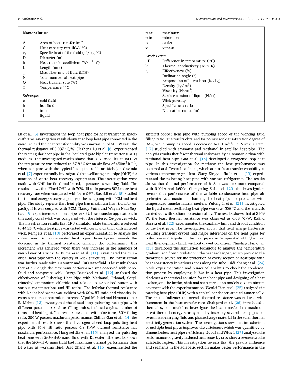 热管用于电子零件冷却,汽车系统,太阳能收集器/存储系统,热交换器和除湿机中,以进行有效的热交换应用。随着热管作为更好的热管理方法的发展,对电子部件应用中废热回收中增强传热的需求已经得到改善。在应用中使用热交换器中的热管时,可以将热传递提高10%到40%。这导致使用带有热交换器的热管以紧凑而有效的方式设计用于废热回收应用的合适的热交换设备。热管用于电子冷却,太阳能收集器,热交换器和除湿机中,以进行有效的热交换。常规可用的热管使用丙酮,甲醇和去离子水作为工作流体,很少使用过的纳米流体。使用三排甲醇和热管对实验室和医院释放的热量进行了回收,这提高了Baghban和majideian报道的效率和有效性[1]。 Vasiliev [2]对带有热交换器的热管进行了研究。热管是有效的热交换设备,可在各种系统中用作热链接,以确保节能并保护环境。杨等。 [3]研究了带有热交换器的热管,以分析汽车中的废气。 Giovanni等。 [4]研究了热管换热器的分析,该热管换热器由54个水平长度为700 mm的水平铜管,厚度为0.115 mm的铝翅片和间距为3 mm的铝翅片组成。使用氢氟烃作为制冷剂(HFC 134a)进行了分析,并将其结果与全球变暖潜力的新型氢氟烯烃[HFO 1234 Ze(E)]进行了比较。实验得出的结论是,制冷剂HFO 1234-Ze(E)的热交换器性能相当于传统的HFC 134a制冷剂。王陆等。 [5]研究了用于航天器传热的环形热管。研究结果表明,环路热管连接在干线上,传热能力最大为500 W,热阻为0.037℃/ W。陆家政等。 [6]在绝缘栅双极型晶体管(IGBT)模块中试验了矩形热管。研究结果表明,与典型的热管散热器相比,气流为450m3 h -1时,IGBT模块在3500 W的温度下可降低至67.8℃。 Mahajan Govinda等。 [7]通过实验研究了用于废热回收设备曝气的振荡热管(OHP)。使用OHP进行了研究,以细化和裸露的正戊烷作为工作流体。结果表明,与裸露的OHP相比,填充率为70%的精细OHP的热回收率高出80%。 Rashidi等。 [8]研究了带PCM和热管的热泵的热能存储能力。研究报告称,如果将热管与PCM结合使用,则具有最大的传热能力。 Nandy Putra和Wayan Nata Septiadi [9]在CPU传热应用的热管上进行了实验。在这项研究中,将珊瑚芯与烧结铜粉芯进行了比较。调查结果表明,在用珊瑚芯测试热导管的情况下,与烧结芯相比,CPU仿真器板的温度降至44.25℃。肯珀斯等。 [10]进行了一项实验,以分析铜水热管中的筛网。调查显示,热阻的降低增强了性能;当灯芯的网眼层数增加时,可实现此增量。 G. Kumaresan等。 [11]研究了具有各种灯芯结构的圆柱形热管。用去离子水和CuO纳米流体进一步进行了研究。结果表明,在45°角处,纳米流体和复合灯芯表现出最大的性能。杜尔加·巴斯塔科蒂(Durga Bastakoti)等。 [12]分析了甲醇,乙醇,十六烷基三甲基氯化铵与各种浓度和填充比的去离子水相关的脉动热管的有效性。当填充比为50%时,去离子水的耐热性较差,粘度随浓度的增加而增加。 Vipul M. Patel和Hemantkumar B. Mehta [13]研究了闭环脉动热管,它们具有不同的参数,例如填充率,倾斜角度,匝数和热量输入。结果表明,在9匝,50%填充率的情况下,200 W具有最佳性能。甘志华等。 [14]实验结果表明,填充率为51%的氢闭环脉动热管具有0.3 K / W的热阻,具有最佳性能。贾宏伟等。 [15]用去离子水对SiO2 / H2O纳米流体的脉动热管进行了分析。结果表明,SiO2 / H2O纳米流体比DI水作为工作流体具有最大的热性能。张静等。 [16] 实验研究了烧结铜热管的抽速与工作流体的填充率。多孔芯在饱和度为92%时获得的结果,而抽速降低到0.1 m3 h-1。Vivek K. Patel [17]在卫星热管中研究了氨和甲醇。分析结果表明,氨气的热阻比甲醇热管小。郭等。 [18]开发了一种低温回路热管。在这项针对甲烷的研究中,最佳性能发生在不同的热负荷下,从而在各种温度梯度下均达到了传热能力。王兴宇,贾力等。 [19]用各种制冷剂对脉动热管进行了实验。结果表明,与R404A和R600a相比,R134a的热性能最高。史承明等。 [20]调查显示,可变电导率热管空气预热器的性能比带有温度传递矩阵模块的常规热管空气预热器最大。于玉龙等。 [21]研究了液态金属振荡热管在500℃下的工作,并用钠钾合金进行了分析。结果表明,在3169 W时,观察到的最小热阻为0.08°C / W。 Kalind Baraya等。 [22]实验了热管的毛细管极限和变干条件。研究表明,由于瞬态变干而产生的热能滞后对热管的脉冲功率耗散有重要影响。热管可以在比毛细管极限更高的热负荷下运行,而不会出现干燥状态。韩朝岭等。 [23]开发了一种模拟技术来分析热交换器中的温度梯度和流动环流,这为保护沿热管各个区域具有热稳定性的热管的每个部分提供了理论依据。张迪迪等。 [24]进行了实验和数值分析,以检查在热管中使用R134a的冷凝过程。该研究公开了一种用于热管和热交换器设计的理论解决方案。 boyko,shah和shah校正模型对实验给出了最小的约定。 Wenlei Lian等。 [25]用锥形冷凝器分析了旋转热管(RHP),进行了数值研究。结果表明,总体热阻随着传热速率的增加而降低。 Shabgard等。 [26]介绍了一种热系统模型,通过在太阳能热发电系统中的载热流体和相变材料之间插入几根热管来研究最大潜热能量存储单元中的热传递。调查显示,引入多个热管可提高效率,这可以通过无量纲热管的效率来量化。 Joudi和Witwit [27]通过在绝热区域设置一段来分析重力感应热管的性能。该研究