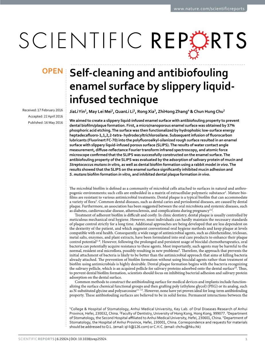 摘 要:我们的目标是创造一种具有抗生物污垢特性的光滑液体灌注搪瓷表面,以防止牙齿生物膜/斑块的形成。首先,通过37%的磷酸蚀刻获得微/纳米孔搪瓷表面。然后通过疏水性低表面能庚二酸-1,1,2,2-四氢癸基三氯硅烷对表面进行功能化。随后将氟碳润滑剂(Fluorinert FC-70)注入聚氟烷基硅烷化的粗糙表面中,形成具有光滑注液多孔表面(SLIPS)的搪瓷表面 。水接触角测量、漫反射傅里叶变换红外光谱和原子力显微镜的结果证明,SLIPS成功地在搪瓷表面构建。通过在体外吸附粘蛋白和变形链球菌的唾液蛋白以及在体内使用兔模型形成牙齿生物膜来评估SLIPS的抗生物污垢特性。结果表明,搪瓷表面上的SLIPS在体外显著抑制粘蛋白粘附和变形链球菌的生物膜形成,并且在体内抑制牙菌斑的形成。