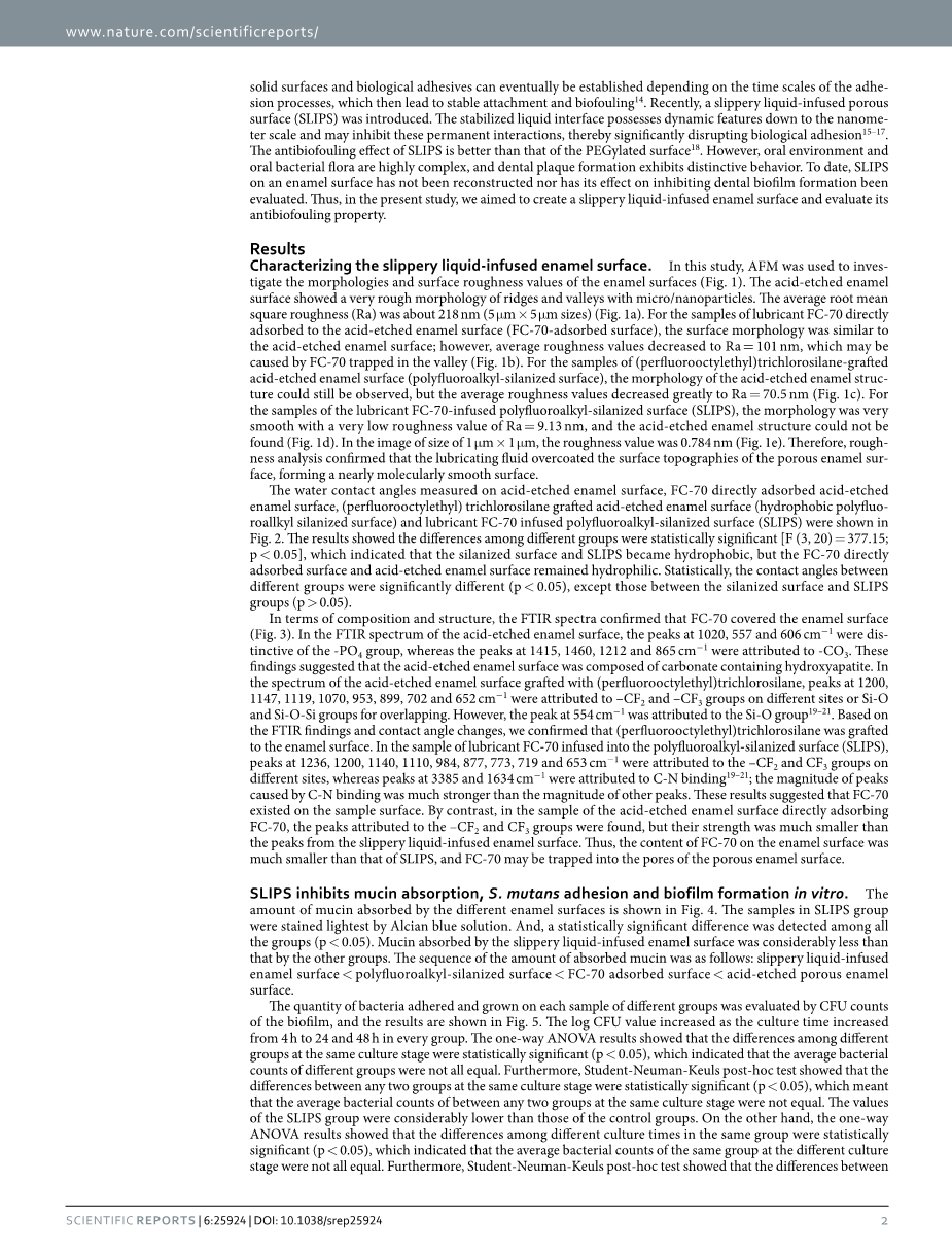 SLIPS受猪笼草叶子的启发,具有非凡的特性,例如拒液性、光滑性、自愈性和抗污垢活性[14-15]。基于三个重要标准,设计了一种由通过微/纳米孔基材锁定在适当位置的润滑液构成的稳定的SLIPS:(ⅰ)最好对固体进行粗糙化以增加润滑液粘附和固定所需的表面积;(ⅱ)润滑流体与固体之间的化学亲和性应高于周围流体与固体之间的化学亲和性;(ⅲ)润滑液和环境液必须基本不混溶[18]。为了满足构造光滑的注入液体防污搪瓷表面的第一要求,采用酸蚀法制备了表面积较大的微/纳米结构粗糙表面,这是临床牙科中常用的技术。微纳米结构的粗糙表面有助于将润滑液液芯吸到搪瓷表面。为了满足第二个标准,采用疏水性低表面能聚氟烷基硅烷对酸蚀后的亲水性粗糙表面进行功能化处理,以匹配选择与环境流体不相容的注入润滑剂的化学性质。在实验中,(全氟辛基乙基)三氯硅烷的表面张力约为,润滑剂FC-70的表面张力约为[18]。(全氟辛基乙基)三氯硅烷的三氯硅烷残留基很容易与搪瓷表面的羟基反应,所以聚氟烷基尾部嫁接在搪瓷表面上,使搪瓷表面具有疏水性。因此,聚氟烷基硅烷化的搪瓷表面比周围的亲水液体更能亲近润滑剂。对于第三个标准,润滑剂是疏水的,但周围的流体是亲水的,因此他们是不混溶的。红外光谱(FTIR)、原子力显微镜(AFM)和接触角的测试结果均证明产生了超疏水性光滑液体注入的搪瓷表面。在构造SLIPS的过程中,酸蚀后的粗糙搪瓷表面的聚氟烷基硅烷化非常重要。如果没有聚氟烷基硅烷化,由于亲水性搪瓷表面和疏水性FC-70不相容,润滑剂FC-70无法均匀地注入多孔搪瓷表面。尽管红外光谱(FTIR)可以检测到FC-70吸附样品表面上的FC-70,但某些FC-70可能仅仅被捕获在粗糙搪瓷表面的孔或谷中。原子力显微镜(AFM)图像、接触角和体外抗污垢测试结果表明,如果不对搪瓷粗糙表面进行聚氟烷基硅烷化处理,则不会形成SLIPS。lt;