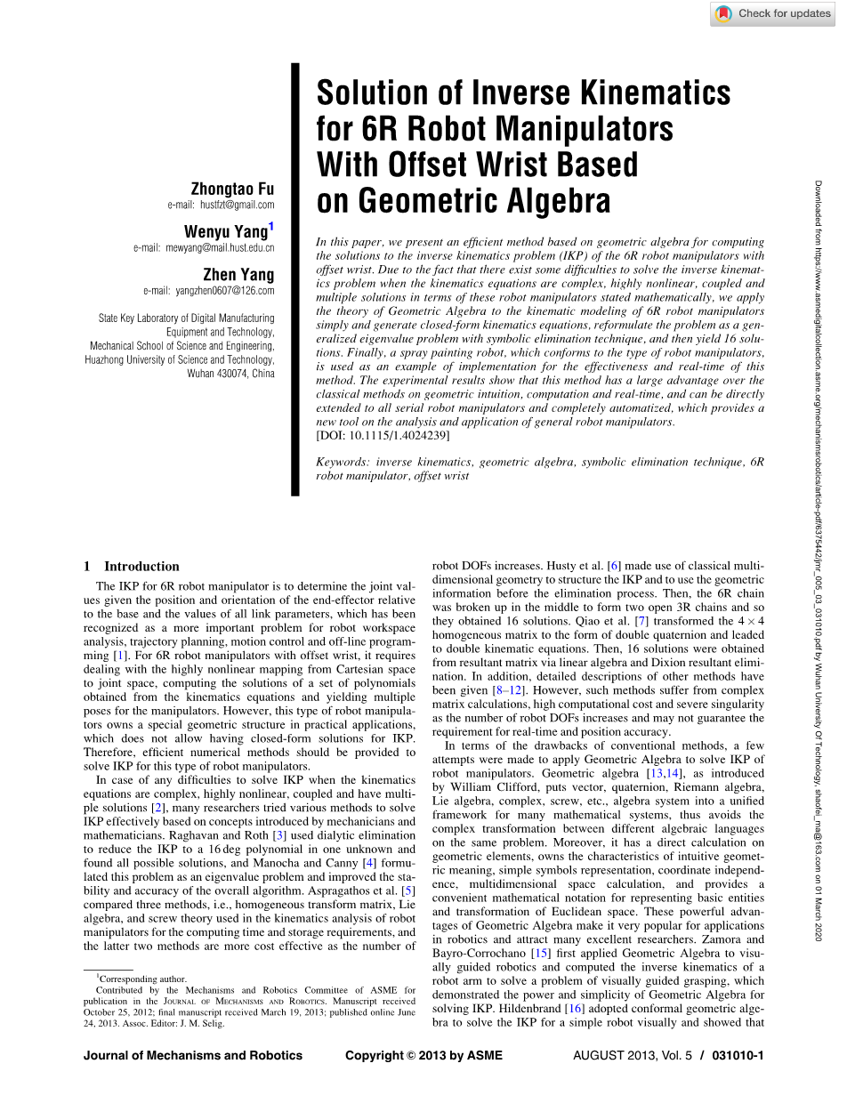 针对常规方法的缺点,已进行了一些尝试来应用几何代数来解决机器人操纵器的IKP。威廉·克利福德(William Clifford)提出的几何代数[13,14]将向量,四元数,黎曼代数,李代数,复数,螺旋等代数系统放入许多数学系统的统一框架中,从而避免了不同数学之间的复杂转换。关于相同问题的代数语言。此外,它可以直接计算几何元素,具有直观的几何含义,简单的符号表示,坐标独立性,多维空间计算等特点,并为表示基本实体和欧氏空间的变换提供了方便的数学符号。几何代数的这些强大优势使其在机器人技术中非常受欢迎,并吸引了许多优秀的研究人员。 Zamora和Bayro-Corrochano [15]首先将几何代数应用于视觉引导的机器人,并计算了机械臂的逆运动学,以解决视觉引导的抓握问题,这证明了几何代数解决IKP的能力和简单性。希尔登布兰德[16]采用共形几何代数从视觉上解决了简单机器人的IKP,并证明了几何代数是计算机科学和动画学的一种有前途的数学工具,随后,[17]提出了一种解决机器人手臂IKP的方法。虚拟人可以实时高效地使用可重新配置的硬件,并确保可以在计算机动画和图形应用程序中非常有利地使用此方法。 Aristidou和Lasenby [18]采用了几何代数来结合IKP,并描述了一种新颖的迭代逆运动学求解器[19] FABRIK,它是使用几何代数实现的,从而解决了人手的IKP用于姿势跟踪的问题。该应用程序证明了几何代数是一种有用的数学工具,可以成功地用于机器人技术中。但是,这些相关研究几乎集中在简化的机械手,拟人化的手臂和机器人上,很少用于复杂的多关节机械手。