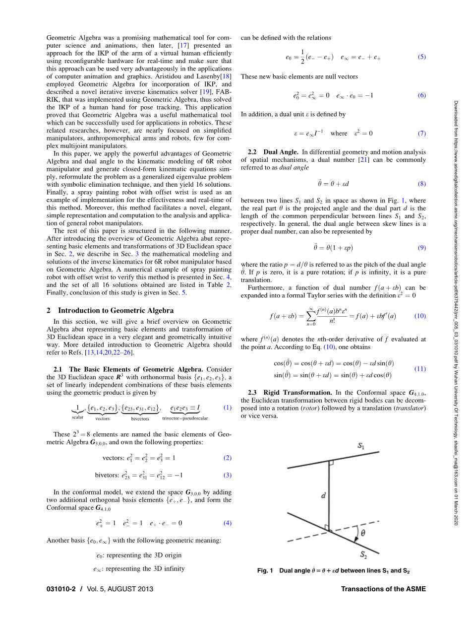 本文其余部分的结构如下。在第2节中介绍了表示3D欧式空间基本元素和转换的几何代数的概述之后,我们在第3节中介绍了基于几何代数的6R机器人操纵器逆运动学的数学建模和解决方案。第4节中给出了带有偏移手腕的喷涂机器人的数值示例,以验证该方法,表2中列出了所获得的所有16个解的集合。最后,第5节中给出了本研究的结论。