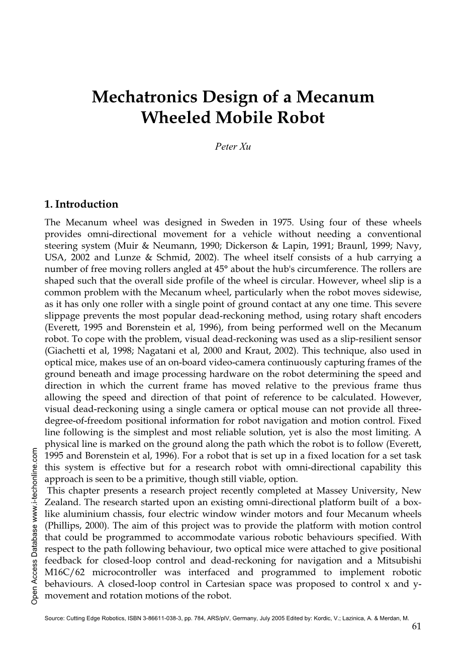 本文介绍了最近在新西兰梅西大学完成的一个研究项目。这项研究始于一个现有的全向平台,该平台由箱形的铝制底盘、四个汽车车窗升降器电机和四个Mecanum车轮组成(Phillips,2000年)。 该项目的目的是为平台提供可编程的运动控制,以适应指定的各种机器人行为。为实现路径跟踪行为,安装了两个光学鼠标进行位置反馈,用以实现闭环控制和导航航位推算,并与三菱M16C/62微控制器接口编程实现机器人行为,还提出了一种笛卡尔坐标的闭环控制方法,用于控制机器人的x、y运动和旋转运动。