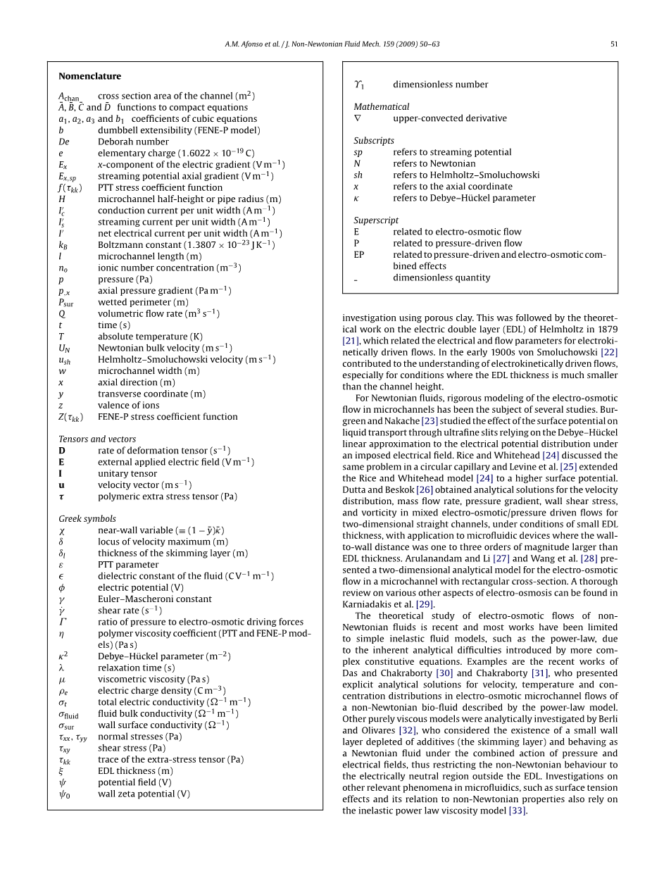 对于牛顿流体,电渗流在微通道中的严格模拟一直是许多研究的课题。Burgreen和Nakache[23]利用Debye-Huckel线性近似于外加电场下的电位分布,研究了表面电位对超细缝中液体输移的影响。Rice和Whitehead[24]在圆形毛细血管中讨论了同样的问题,Levine等人[25]将Rice和Whitehead模型[24]扩展到更高的表面电位。Dutta和Beskok [26]在小EDL厚度条件下,获得了二维直通道混合电渗/压力驱动流中速度分布,质量流