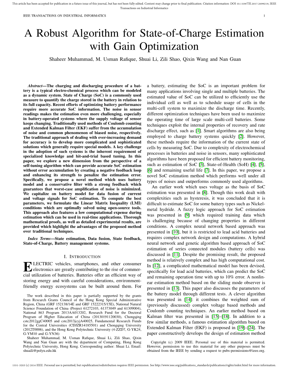 摘要—电池的充放电过程是一个典型的电化过程,可以模拟成一个动态系统。荷电状态(SoC)是一种常用的措施,以量化的电荷存储在电池的相对于其充分的能力。最近优化电池性能的努力需要更准确的SoC信息。传感器读数中的噪声使得估计更加困难,特别是在电池供电系统中,传感器的供电电压不断变化。传统的库仑计数法和扩展卡尔曼滤波法分别存在噪声积累和偏置噪声现象。处理不断增长的精度需求的传统方法是开发更复杂和完善的解决方案,通常需要特殊的模型。采用这种系统的一个关键挑战是对专业知识和基于测试的调优的固有需求。本文从自校正算法的角度探讨了一个新的维度,通过建立一个负反馈回路,提高其补偿估计误差的能力,在不增加误差积累的情况下,提供准确的SoC估计。具体的,我们提出了一种利用电池模型和具有强反馈的保守滤波器的新方法,保证了最差情况下的噪声放大最小。利用电池模型进行电流和电压信号的数据融合,进行SoC估计。为了计算出最佳的参数,我们提出了线性矩阵不等式(LMID)条件,并使用开源工具对其进行了优化求解。该方法计算量小,可用于实时计算。提供了完整的数学证明和详细的实验结果,突出了该方法相对于传统方法的优点。