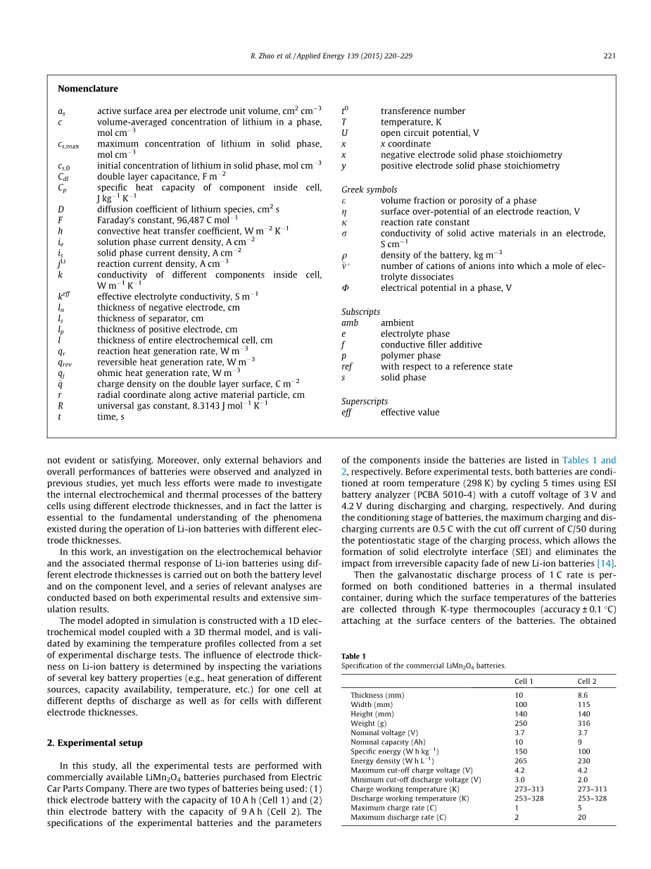 迄今为止,人们已经进行了大量的研究工作,通过开发新的电极化学和设计不同的电池几何形状来促进锂离子(Li-ion)电池技术的发展[1-5]。一般来说,锂离子电池在航空航天、插电式混合动力汽车和电动汽车等领域的应用需要较高的比能和能量密度。为了实现这一目标,电极作为电池中主要的储能元件,在不同的材料载荷、颗粒尺寸、孔隙度和厚度下进行了设计,并在各种实验中进行了推广和测试[6-10]。例如,郑报告了一种由聚偏二氟乙烯和乙炔黑组成的优化的LiNiCoAIO阴极,其中容量在不损失功率密度[11]的情况下,采用低活性材料提高了电极的能量密度。同时,比容量从102 mA h g-1到138 mA h g-1当活性颗粒的平均直径从1000nm降低到60nm[12]时,在湖沼粉中观察到1。24 此外,一些研究电极厚度的影响报道:两种类型的电极(LiNiCoMnO和LiFePO)与不同厚度被用于调查电极厚度的影响总体性能的电池[13],结果表明厚电极可以提供更高的能量密度但更快的能力衰退速率和更低的功率密度;不同厚度的LiMn2O4阴极电池也被组装起来,以测试最佳的阴极负载,这有助于构建一个高性能电池[6]。然而,在大多数文献中,对不同电极厚度的电池的分析仅仅是基于实验结果,而对不同电池之间的容量衰减差异的解释是不明显或不令人满意的。此外,只有外部行为和总体性能的电池进行了观察和分析在先前的研究中,然而,更在努力调查内部的电化学和热过程电池使用不同电极厚度,事实上,后者是至关重要的基本理解现象存在在锂离子电池电极厚度不同的操作。