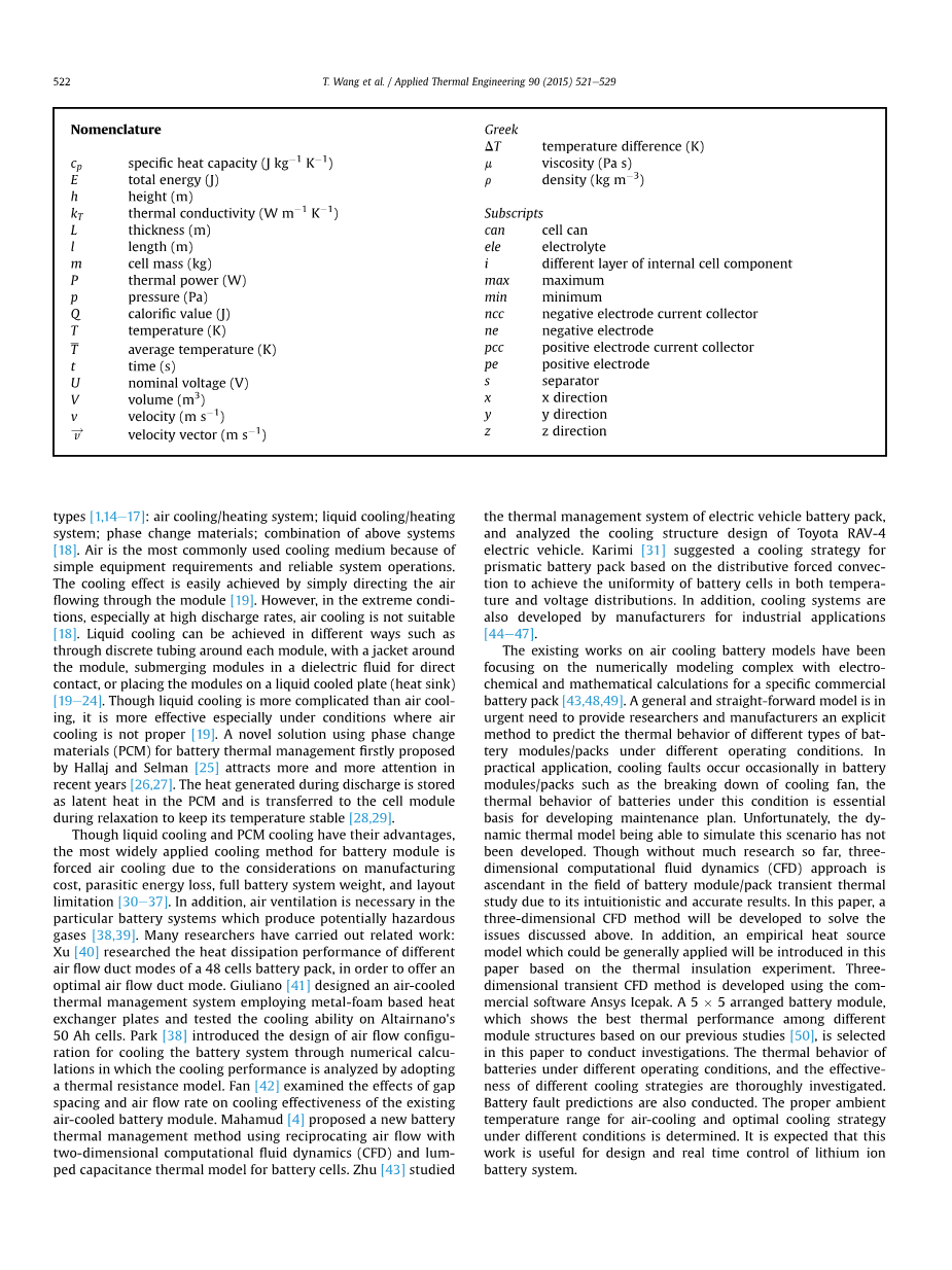 尽管液体冷却和动力系统控制模块冷却各有其优点,但由于考虑到制造成本、寄生能量损失、电池系统的全重量和布局限制,目前应用最广泛的电池模块冷却方法是强制风冷[30-37]。此外,在产生潜在危险气体的特定电池系统中,空气通风是必要的[38,39]。Xu[40]对48电池组不同风道方式的散热性能进行了研究,以提供最佳的风道方式。Giuliano[41]设计了一种采用金属泡沫换热板的风冷式热管理系统,并在Altairnano的50ah电池上测试了其冷却能力。Park[38]通过数值计算介绍了冷却电池系统的气流结构设计,其中采用热阻模型分析了冷却性能。Fan[42]研究了间隙间距和空气流速对现有风冷电池模块冷却效果的影响。Mahamud[4]结合二维计算流体力学(CFD)和电池集总电容热模型,提出了一种基于往复气流的电池热管理新方法。Zhu[43]研究了电动汽车电池组的热管理系统,分析了丰田RAV-4电动汽车的冷却结构设计。Karimi[31]提出了一种基于分布强迫对流的棱柱形电池组冷却策略,以实现电池在温度和电压分布上的均匀性。此外,制造商还为工业应用开发了冷却系统[44-47]。