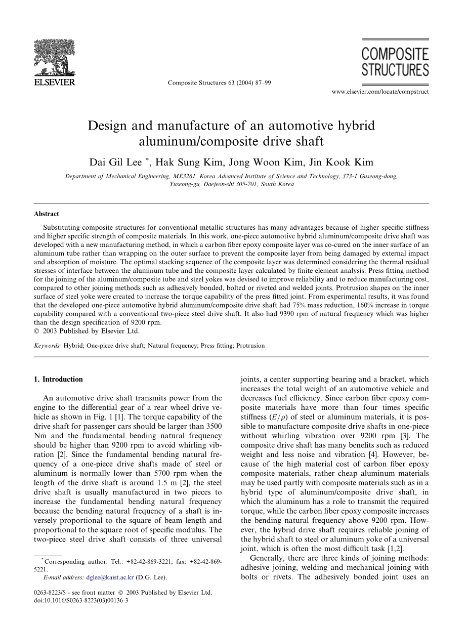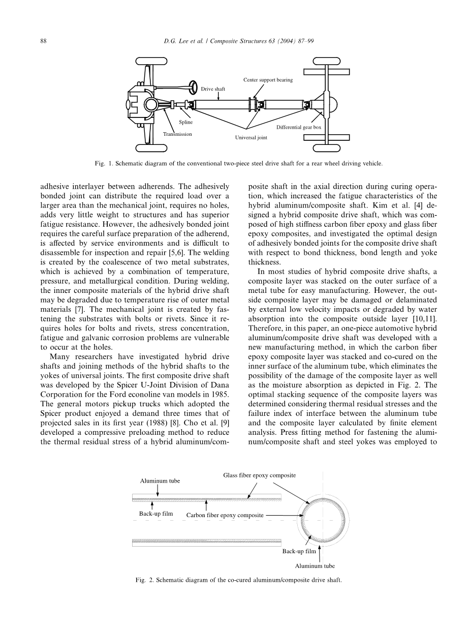 由于螺栓和铆钉需要开孔,孔处容易产生应力集中、疲劳和电偶腐蚀等问题,许多研究人员对混合动力传动轴及其与万向节叉的连接方法进行了研究。1985年,由DanaCorporation的Spicer U-Joint部门为福特econoline面包车开发了第一个复合传动轴。采用Picer产品的通用皮卡在其第一年(1988年)的预期销售需求是预期的三倍[8]。Cho等人[9]采用压缩预压法降低铝钴复合材料的热残余应力,将轴定位在轴向,提高了铝/复合材料混合轴的疲劳性能。Kim等人。[4] 设计了一种由高刚度碳纤维环氧树脂和玻璃纤维环氧树脂复合材料组成的复合材料驱动轴,研究了复合材料驱动轴在粘结厚度、粘结长度和横截面厚度等方面的胶接接头优化设计,为便于制造,在成釉管外表面堆积了一层复合材料。