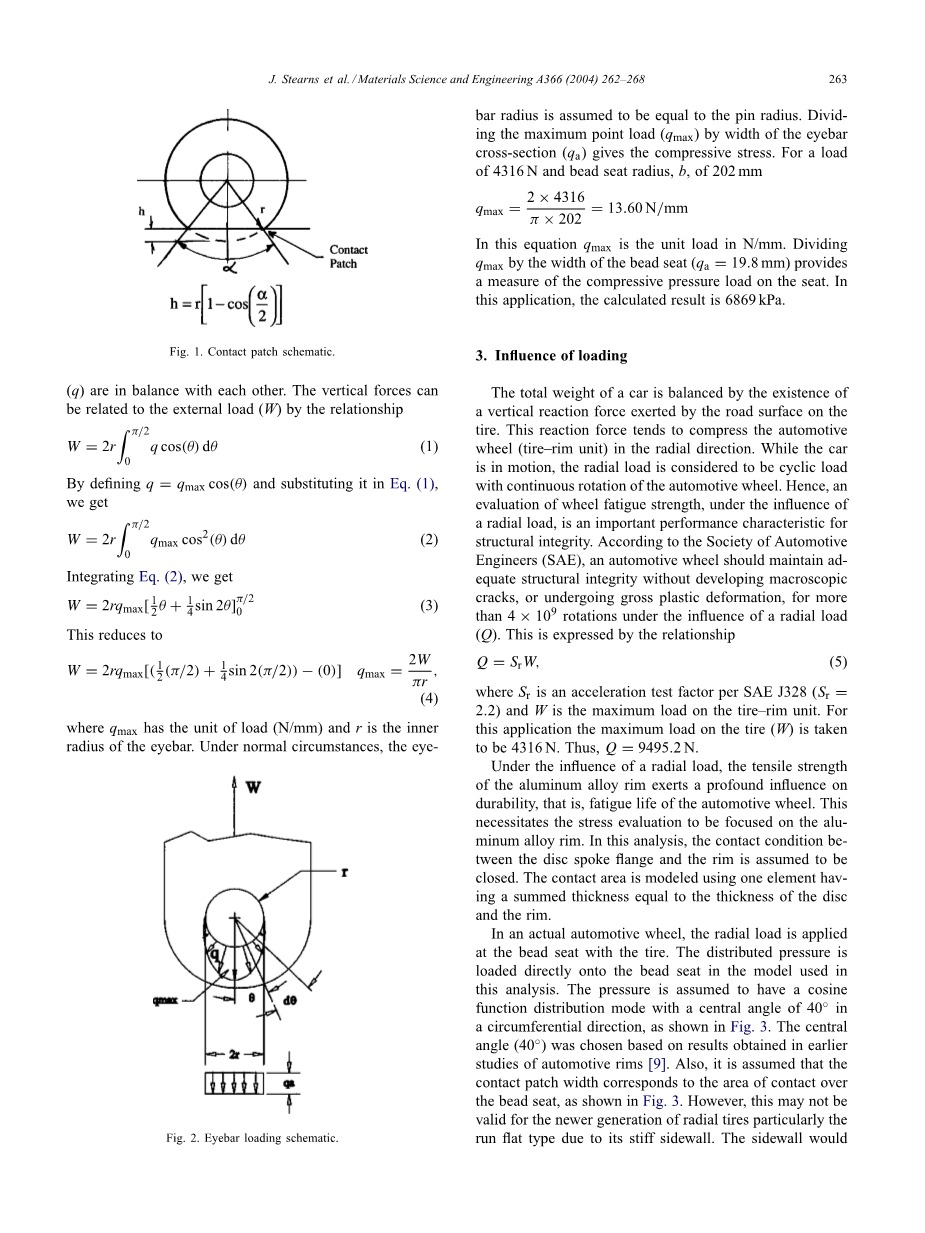 在过去的五十年里,汽车车轮已经从早期的木制和钢制轮辐设计逐步发展到用于货车和自行车的托轮,到扁钢盘,再到最近几年的金属冲压成形。当前和新一代地面车辆中的冲压金属配置是由铸态铝合金或铸加锻造状态制成的。多年来,只有在多年的经验加上严格的现场试验之后,机械设计才能取得成功[1]。自20世纪70年代初以来,机械测试和实验应力测量的一些创新方法得到了发展和尝试。然而,在过去20年里,这些程序有了显著的进步,随着各种创新实验方法和结构分析方法的出现而不断完善。基于疲劳寿命预测和可靠性的耐久性分析用于评估工程结构的响应,也被用于汽车轮辋的研究[2,3]。安装在轮辋上的子午线轮胎的力学响应建模非常复杂,需要考虑非线性分析(轮胎部分)和线性静应力分析(轮辋部分)。两个组件的接口可以使用contact元素来建立。关于这一问题的初步结果表明,轮胎-轮辋单元上的实际载荷采用余弦函数的形式,其中心角约为40度,测量从接触点的任何一边与地面(图1)[4-6]。随后的研究工作证实了40度角,并将其归因于轮胎的接触片几何形状[7]。这基本上意味着当轮胎完全充气时,在与地面的接触点处会发生爆胎。这被称为接触片。接触片的长度转换为与轮辋接触的“胎圈座”区域扫掠的角度。其他胎圈座区域往往会被拉离轮辋,并且假定这些区域不存在载荷。