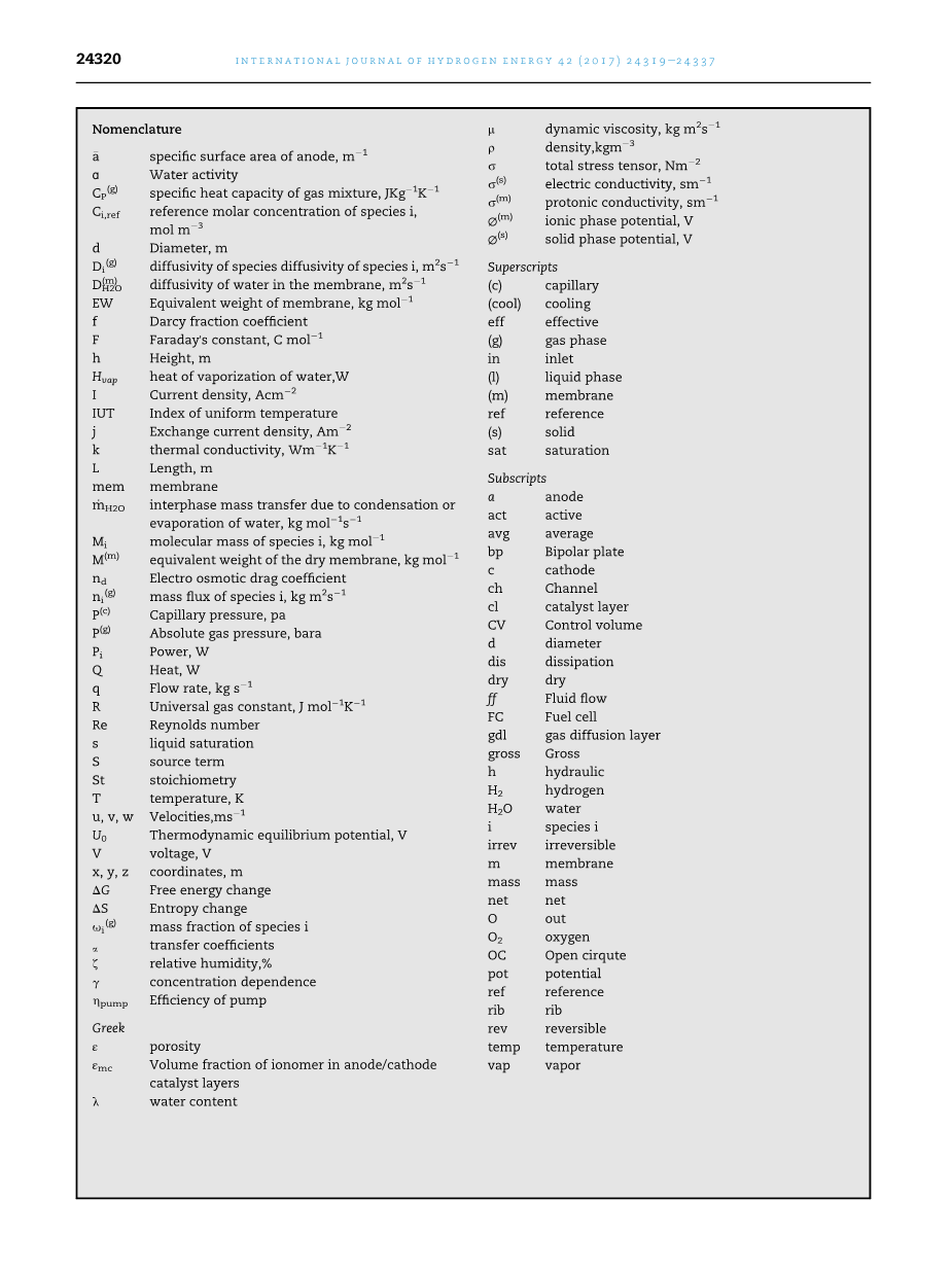 寿命上起到关键作用,因为温度不均匀造成了不同地方的电化学反应速率不同,导致热点的形成,从而降低了PEMFC的稳定性和耐久性。在燃料电池电堆中,通常采用的冷却方法是在阳极和阴极之间设计具有内部冷却通道的双极板。Chen等人[9]通过恒热通量壁对冷却流场结构进行传热性能研究,优化了质子交换膜燃料电池电堆的冷却流场设计。提出了均匀温度指数(IUT)的概念,即在整个冷却板区域内的温度变化,它用来评价冷却板上的温度分布均匀程度。分析比较了三种蛇形模型和三种平行模型。结果表明,与平行模型相比,蛇形构型具有较低的IUT(较好的冷却效果),而对冷却通道压降的比较表明,平行模型比蛇形模型的压降更低。因此,冷却效果与压降之间的优化需要进一步研究。Adzakpa等人[10]考虑了单个燃料电池的三维动态热模型,研究了采用空气冷却时燃料电池从底部到顶部的温度分布。模型采用有限差分法建立,并在Matlab/Simulink环境下实现。结果显示,细胞顶部的温度比底部的温度要高,差异高达5℃。此外,电堆间不同电池空气冷却的不均匀性导致了较大的温度变化,最高可达8℃。Sangseok Yu和Jung[11]研究了具有大活动区域的PEMFC系统的热管理策略。他们改进了PEMFC的热模型和热管理系统,以研究热管理的标准。他们的燃料电池模型包括水通过膜电解质的传输、阴极催化剂层的电化学反应和燃料电池内部的二维温度分布的子模型。建立了散热器、冷却泵和风机的热力管理系统模型,并进行了温度分布效应与泵寄生损耗之间的权衡。他们的输出结果包括以下部分:燃料电池的最高温度被建议作为代表操作温度,因为它比其他可能的温度更容易测量和监控。建议对冷却风机进行反馈控制,以最高运行温度作为反馈信号。操作温度的参考值取决于系统,并应根据膜的耐久性和系统的暂态安全裕度来确定。考虑温度分布对燃料电池性能的影响和泵的寄生损耗之间的权衡,冷却泵的运行应该被监控以实现更高的净发电量。Kandlikar和Lu[12]研究了PEMFC的热管理和水管理。由于水和热的耦合输运机制是密切相关的,他们讨论并计算了燃料电池所有部分的产热,包括双极板、催化剂层、气体扩散层和膜,并表明阴极催化剂层的产热大于阳极催化剂层。Seung Ho Yu等人[13]模拟了六种冷却流场,包括蛇形流场、多通道蛇形流场(MPSFF)和螺旋流场,并对冷却流场施加恒定的热通量。结果表明,MPSFFs的最大温度和温度均匀性均优于传统的蛇形流场。同时也研究了雷诺数和热流密度对冷却性能的影响。增加雷诺数或降低热流导致最高温度、温度梯度和温度均匀性呈线性下降。Carton等人在一个PEMFC上设计了一个实验研究,研究在三种不同的流场结构下(蛇形、迷宫和平行流场),哪些参数对燃料电池性能会有影响。他们考虑了影响PEMFC输出电压、电流、功率和效率的输入参数。结果表明,平行流板在较高压力下的性能较好,但总体上蛇形流板的性能较好。Seung Man Baek等人[15]也研究了不同的冷却流场,并从压降、温度均匀性和最高温度三个方面进行了分析和比较。结果表明,多通道蛇形流场比常规蛇形流场具有更好的性能。Sasmito等人[16]研究了加入液态水的冷却剂板对PEMFC性能的影响。结果表明,在冷却剂板之间放置的电池数量影响了电堆的热包膜和电池性能。当更多的电池被放置在冷却剂板之间时,除非冷却温度降低,否则由于温度的升高和薄膜中含水量的减少,电堆的性能会下降。此外,当冷却剂速度从0.5m /s增加到2m /s时,PEMFC的性能提高了5%。因此,增加冷却剂速度和在冷却剂板之间放置更多的电池可以提高燃料电池的性能。Sasmito等人[17]的各种热管理策略,包括在以液体或空气作为冷却剂的专门设计的冷却板/通道上的强制对流,边缘空气采用加强肋冷却;在PEMFC电堆外结合氧化剂和冷却剂流(开放式阴极)与强制对流和自然对流空气冷却。他们还研