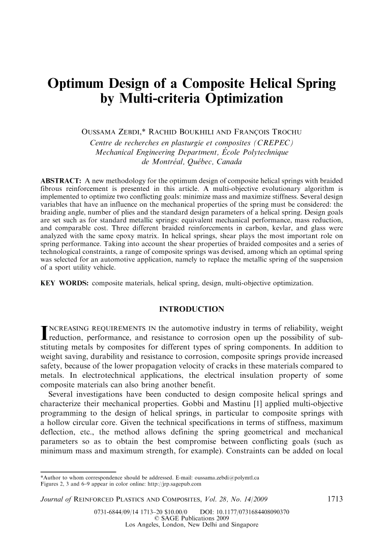 对复合螺旋弹簧的设计和力学性能进行了研究。Gobbi和Mastinu[1]将多目标规划应用于螺旋弹簧的设计,特别是应用于具有空心圆芯的复合弹簧。考虑到刚度、最大挠度等技术指标,该方法允许定义弹簧的几何和机械参数,从而在相互冲突的目标(例如最小质量和最大强度)之间获得最佳折衷。可以在本地上添加约束以及全局稳定性、谐振频率等。建立了数学模型并进行了验证。Yokota等人提出了螺旋金属弹簧的最优重量设计问题,该问题对螺旋金属弹簧的许用剪应力、主动线圈数量和线圈平均直径都有限制。将其表示为带有非线性约束的整数规划问题,用遗传算法求解。Lecarpentier[3]和Ratle等人将多目标优化方法应用于复合螺旋弹簧的优化设计。在Charlebois等人的实验研究中,测定了编织复合材料在不同编织角度下的力学性能,Harte和Fleck[6,7]描述了管状编织复合材料在拉伸、压缩和剪切中的力学性能。最近,Zebdi[8]对管状和螺旋状复合弹簧进行了实验表征。这些研究为复合螺旋弹簧的设计提供了有价值的信息,这也是本研究的目的所在。
