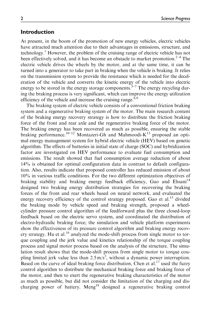电动汽车制动系统由传统摩擦制动系统和电机再生制动系统组成。制动能量回收策略的主要研究内容是如何分配前后轴的摩擦制动力和电机的再生制动力。最大限度地回收制动能量,保证了制动性能的稳定10-12 。Montazeri-GH和Mahmoodi-K13提出了一种基于遗传算法的混合动力汽车(HEV)最优能量管理系统。研究了电池荷电状态(SOC)和杂化因子对混合动力汽车性能的影响,以评价混合动力汽车的油耗和排放。结果表明,与默认配置相比,优化配置的油耗平均降低约14%。结果表明,该控制器在不同的交通条件下,减少了约10%的排放。针对制动稳定性和制动能量反馈效率这两个不同的优化目标,Gao和Ehsani14设计了两种基于神经网络的前后轮制动力恢复制动能量分配策略,并对所提出的控制策略的能量回收效率进行了评价。Gao等15将制动方式按车速和制动强度进行划分,提出了前馈加基于电伺服系统的三闭环反馈的轮缸压力控制算法,协调电液制动力的分配;仿真和整车平台实验表明,该控制算法和制动能量回收策略是有效的。Hu等16在分析结构的基础上,分析了单电机向转矩联轴器的模移过程,以及转矩联轴器过程与信号电机过程的脉动值和动力学关系。仿真结果表明,从单电机到转矩联轴器的模移过程中,限制冲击值小于2.5m/s3,没有动态电源中断。基于理想制动力分配曲线,Chen等人17的模糊控制算法用于分配机械制动力和制动力的电机,然后对再生制动电动机尽可能多的特点,但没有考虑电池的充电和放电功率的限制。Meng18设计了一种基于模糊控制的再生制动控制策略,能满足制动规程的要求,并能最大限度地回收制动能量。协调再生制动控制策略,设计模糊控制器,输入转速、电池荷电状态、制动强度,输出轴前后制动力分配系数、电机制动力分配系数、机械制动力分配系数。