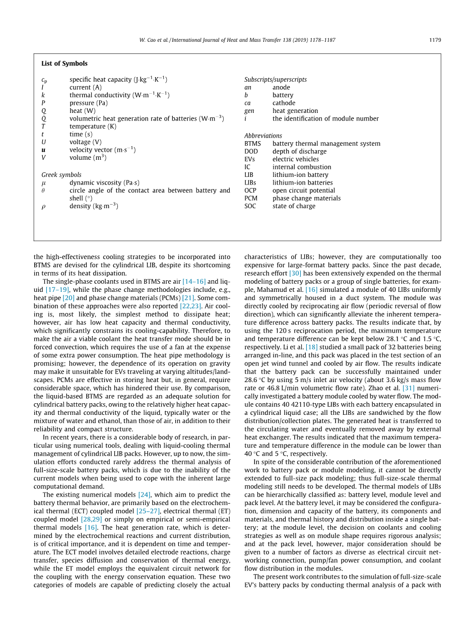 电动汽车的核心是电池组,它可以由许多单个LIB组成。例如,Tesla Roadster的电池组包含6831 18650型Panasonic LIB。电池组由11个串联的“板”组成,每个“板”通常由9个串联的模块(“砖”)组成,每个模块具有69个并联的电池单体。在电池组中,建议电池在20–45 C的温度范围内工作,以在使用寿命和安全方面取得最佳效果。此外,电池组两端的温度应尽可能保持一致[3]。如果不满足此条件,电池最终将遭受不良后果,例如,电动汽车的可靠性和耐用性下降,循环寿命降低[4],热失控[5],[6]和火灾爆炸[7],[ 8]。因此,需要先进的电池热管理系统(BTMS)来解决这些对道路电动汽车的热影响[9],[10],[11]。