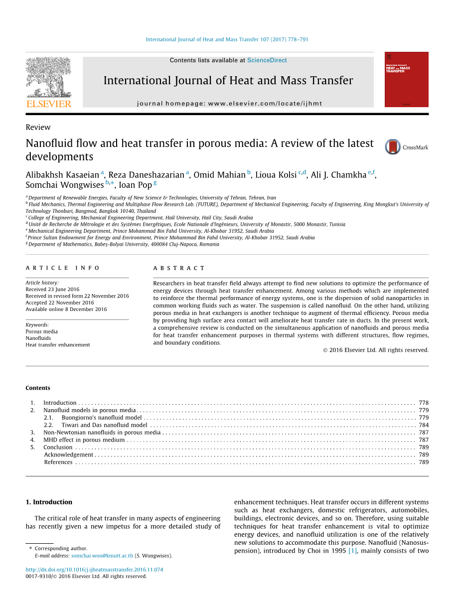 Mahdi等人对纳米流体在多孔介质中的流动和传热进行了综述。首先,他们收集了有关多孔介质的主要特性的信息,如孔隙率、渗透率和有效导热系数。然后,着重介绍了纳米流体的热物理性质和对流换热的类型。然而,目前的研究主要集中在用于模拟纳米流体在多孔介质中流动的常用模型上。