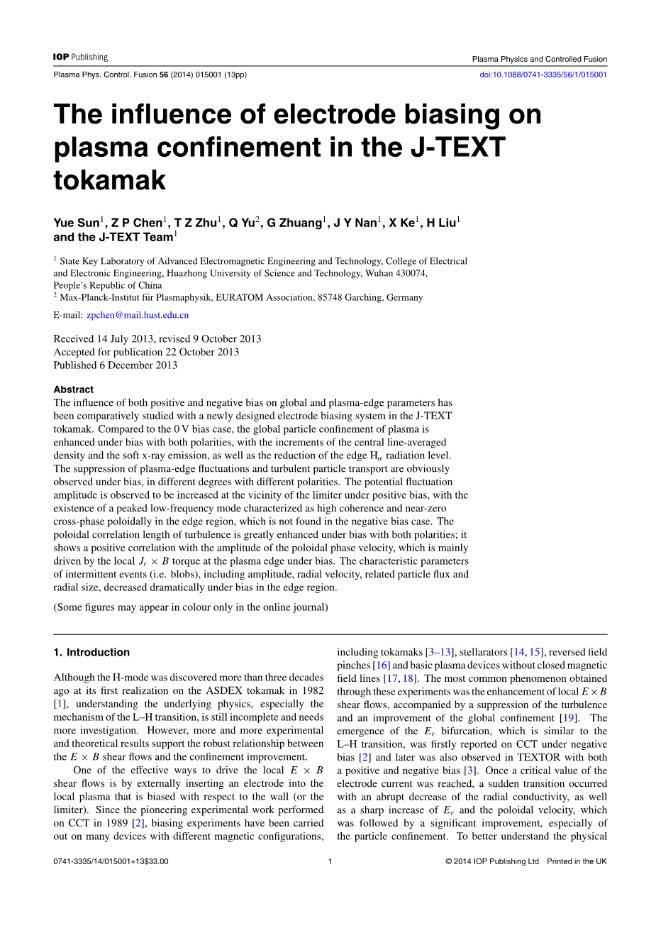 将电极从外部插入边缘等离子体中,且相对于真空室壁面(或限制器)加一定偏压,是驱动局部Ertimes;B剪切流的有效方法之一。自从1989年在CCT托卡马克上进行了开创性的实验工作[2]以来,人们已经在许多具有不同磁结构的装置上进行了偏压实验,包括托卡马克[3-13]、仿星器[14,15]、返场箍缩[16]和没有闭合磁力线的基本磁场设备[17,18]。通过这些实验获得的最普遍的现象是:局部Etimes;B剪切流的增强,伴随着湍动输运的抑制和等离子体约束状态的改善[19]。在负偏压条件下[2],径向电场Er分叉现象的出现与L-H模的转化相似, 这一现象在CCT托卡马克上得到了明确的阐述,随后在TEXTOR装置中,利用正、负极性的偏压电极均实现了类似现象。当电极偏压电流爬升到某一临界值时,随着径向电导率的急剧下降,湍流极向相速度和Er平衡量剪切增加,伴随着显著的改善,特别是粒子约束的改善。为了更好地理解偏压下Er平衡分布分叉行为的物理机制,基于电荷守恒方程建立了理论模型。该模型认为,两个非线性项之间的相互作用,及新经典体粘滞效应和离子轨道损失效应,导致了Er的分叉现象;在相同的边界条件下,Er的各种空间结构都是可能的。