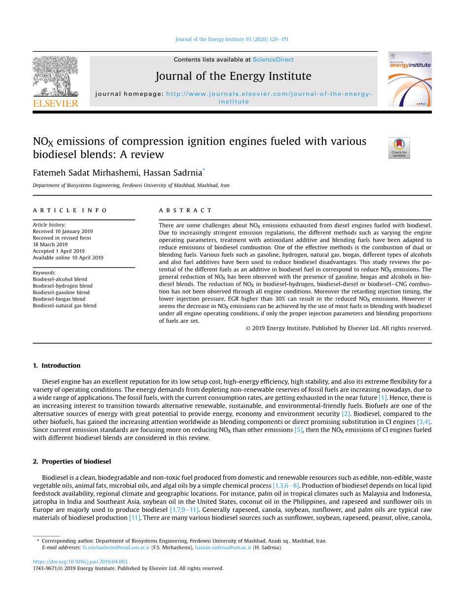 柴油发动机有着低成本,高热效率,高稳定性以及在各种工况下较高灵活性的有点。如今,由于应用范围广泛,对于与化石燃料的需求正在增加。根据目前的消耗率,在不久的将来化石燃料将被耗尽。因此,对于替代性可再生、可持续和环境友好型的燃料,成为研究的热点。生物燃料是替代能源之一,具有能源,经济和环境安全的巨大潜力。与其他生物燃料相比,生物柴油由于在压燃式发动机中掺混燃烧或直接使用有希望成为化石燃料的替代品而在全球范围内受到越来越多的关注。由于当前的排放标准将重点放在减少NOX上,而不是其他排放,因此在本综述中考虑了使用不同生物柴油混合物燃料的压燃式发动机的NOX排放。