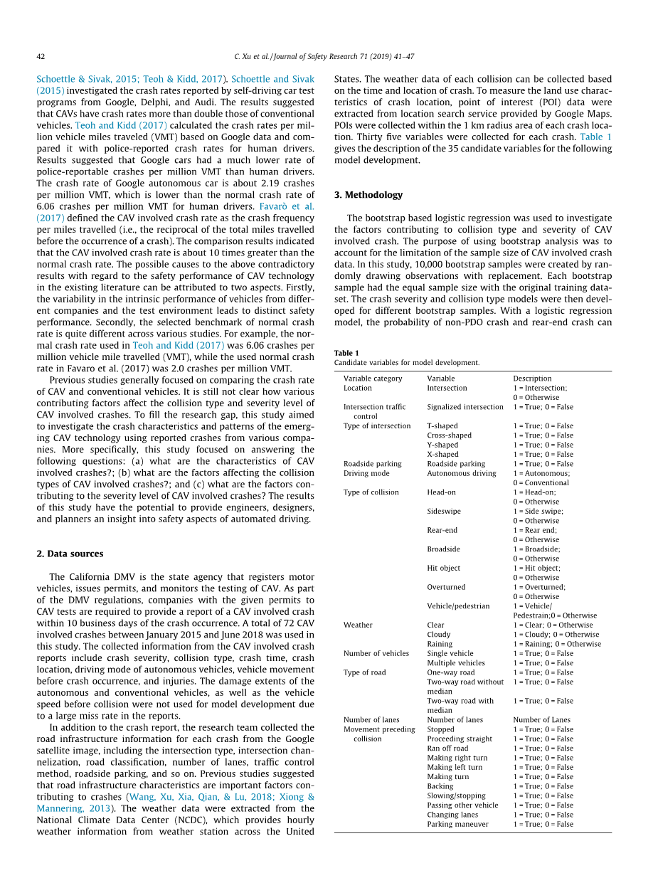 除了车祸报告,研究小组还从谷歌卫星图像中收集了每次车祸的道路基础设施信息,包括路口类型、路口渠化、道路分类、车道数、交通管制方法、路边停车等。先前的研究表明,道路基础设施特性是导致车祸的重要因素。这些天气数据是从国家气候数据中心(NCDC)提取的,该中心提供美国各地气象站每小时的天气信息。每次碰撞的气象数据可以根据碰撞的时间和地点进行采集。为了测量坠机地点的土地利用特征,从Google Maps提供的位置搜索服务中提取了兴趣点(POI)数据。在每个碰撞地点的1公里半径范围内收集泊松指数。每次碰撞收集35个变量。表1给出了以下模型开发的35个候选变量的描述。