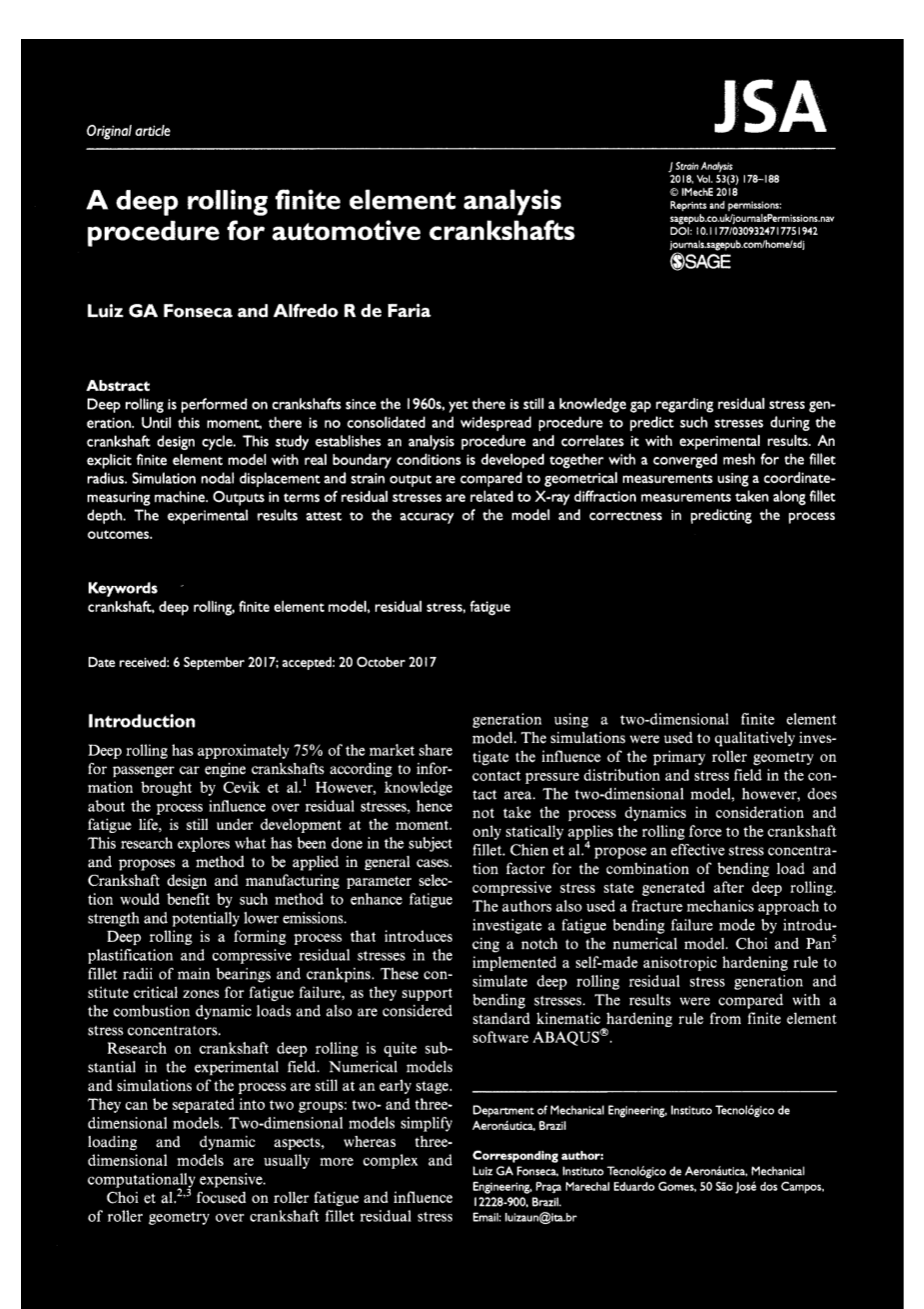 模型建立的第一步是曲轴几何形状的简化,然后是材料模型的选择和边界与接触条件的应用。特别注意在网格重建时,实现收敛的结果。通过圆角半径几何测量对提出的模型进行验证,以观察其与实际的第一对应关系。将模拟残余应力与沿圆角深度的实测数据进行对比,突出了二者之间的相关性。
