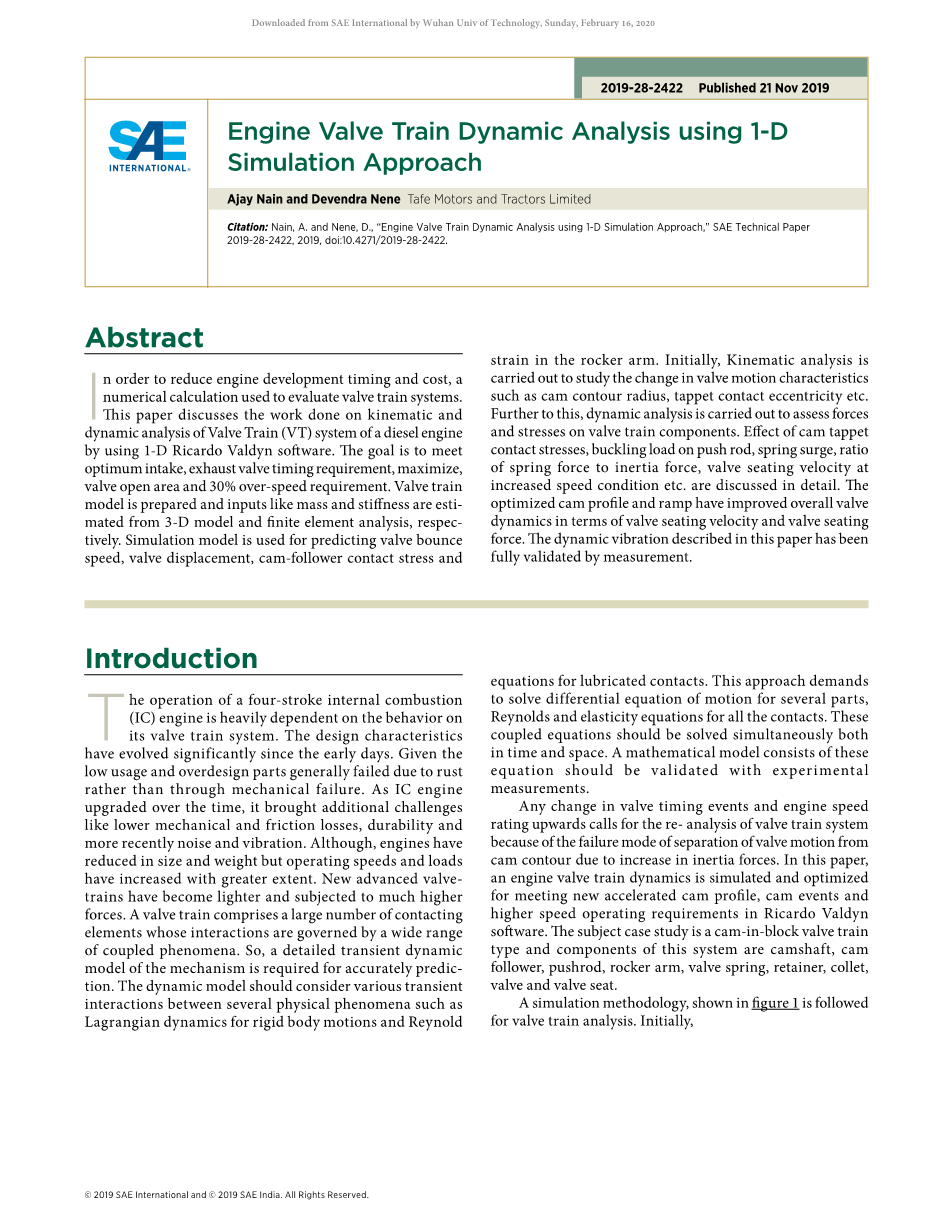 四冲程内燃机(IC)的运行在很大程度上取决于其气门机构系统的性能。从早期开始,设计特性就已经发生了显著变化。考虑到低使用率和过度设计的零件通常是由于生锈而不是机械故障而失效的。随着内燃机的不断升级,它带来了更多的挑战,如更低的机械和摩擦损失、耐久性以及最近的噪音和振动。虽然发动机的尺寸和重量有所减小,但运行速度和负荷都有较大幅度的提高。新的先进气门机构变得更轻,承受更大的力。气门机构由大量的接触元件组成,其相互作用受多种耦合现象的控制。因此,需要建立详细的机构瞬态动力学模型来进行精确预测。