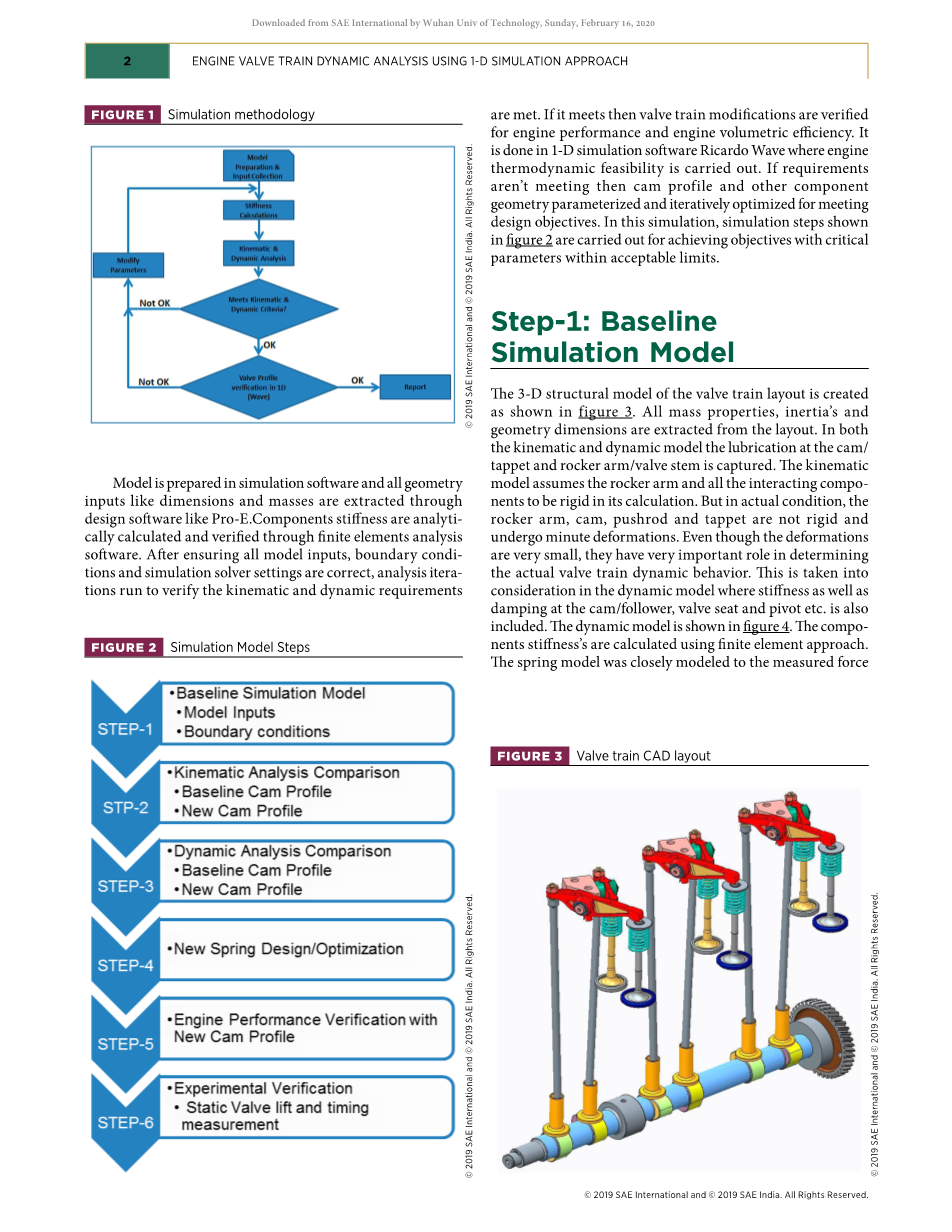 首先,在仿真软件中建立模型,通过如Pro-E等设计软件提取尺寸、质量等几何输入。通过有限元分析软件对构件的刚度进行分析计算和验证。确保所有模型输入,边界条件和模拟求解器设置正确后,运行分析迭代以验证是否满足运动学和动力学要求。如果满足要求,则将验证气门机构的改装是否符合发动机性能和发动机容积效率。在一维数值模拟软件Ricardo-Wave中进行,验证了发动机热力学可行性。如果不能满足要求,则可以对凸轮型线和其他零部件几何参数化并迭代优化以满足设计目标。这个模拟中,为了实现关键参数在可接受范围内的目标,执行图2所示的模拟步骤。
