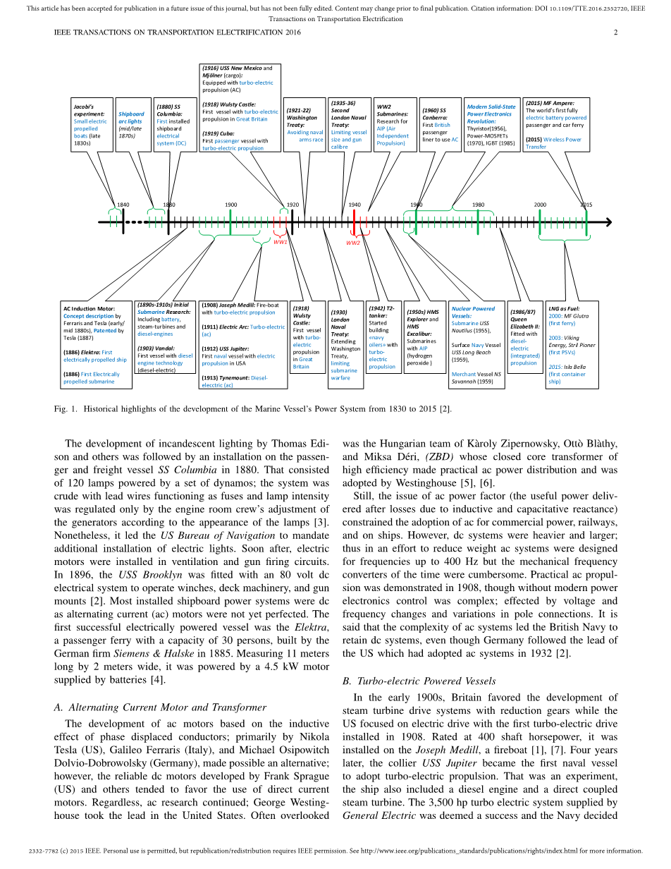 交流感应电动机、变压器和柴油机的发明,在19世纪末20世纪初促使了人们进行新的研究和开发。最早的商用船用电气系统使用记录就是历史上可追溯到19世纪80年代的“哥伦比亚号”( Columbia)上的舰载直流系统。在这一时期,科学家对潜艇、电池、汽轮机和柴油机进行了首次研究。第一次世界大战之前最重要的两项相关发展是1903年的第一艘柴油电力船(Vandal)和1912年的第一艘电力推进海军船(USS Jupiter)。在第一次世界大战之前的紧张局势升级期间,第一批带有涡轮电动推进装置的货船在美国和英国得到构思和开发。第二次世界大战的爆发激励了电力系统的新发展,随之带来了具有涡轮电力推进的T2坦克。20世纪50年代后期出现了核动力船,并且在交流电动机发明70年后,1960年(SS堪培拉)启用了第一个使用交流电的客轮。在1956年至1985年期间,由创新的固态技术引发的电力电子革命标志着船舶新时代的开始——全电动船的时代。因此,女王伊丽莎白二世于1987年推出了第一台柴电集成推进系统。在过去的二十年中,船舶行业目睹了第一批以液化天然气为燃料船舶的发展。2015年1月标志着全电动船时代的开始,世界上第一艘纯电池驱动的汽车和客运渡轮安培被投入使用,并在挪威定期运营。图1引导读者了解1830年至2015年船舶电力系统演变的里程碑。然而,电动海洋船舶的新时代并非没有挑战。接下来,本文重点介绍了海洋船舶发展演变的不同阶段以及电力使用对这一演变的影响。跟随历史发展进程,本文将移步现代电动船推进,讨论向混合交流/直流和纯直流电力系统方面迈进,追求电气稳定性,减少谐波污染,提高海洋船舶类独立的微型电网电能质量、发展电池储能系统,并朝着无排放操作靠拢等系列挑战。针对这些挑战,再提出潜在的解决方案和可能的道路。