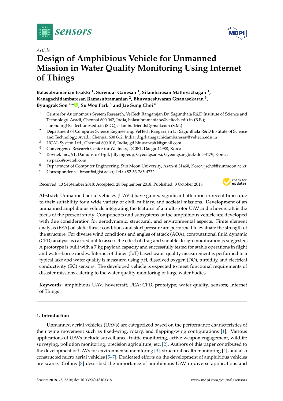 摘要:近年来,无人机(uav)由于适合于各种民用、军事和社会任务,受到了广泛的关注。目前研究的重点是综合多旋翼无人机和气垫船的特点,研制一种无人两栖车辆。本文水陆两栖车辆的部件和子系统的开发充分考虑了空气动力学、结构和环境方面,并且对结构进行了静推力和裙部压力的有限元分析,对结构的强度进行了评价。其中针对不同的风况和迎角(AOA),采用计算流体动力学(CFD)方法对阻力的影响进行了分析,并提出了相应的设计修改意见。原型机具有7公斤的有效载荷能力,并在飞行和水载模式下成功地进行了稳定操作测试。基于物联网(IoT)的水质测量是在一个典型的湖泊和水质测量使用pH值,溶解氧(DO),浊度,电导率(EC)传感器。本文开发的车辆预计将满足灾害特派团的功能要求,以满足大型水体水质监测的需要。