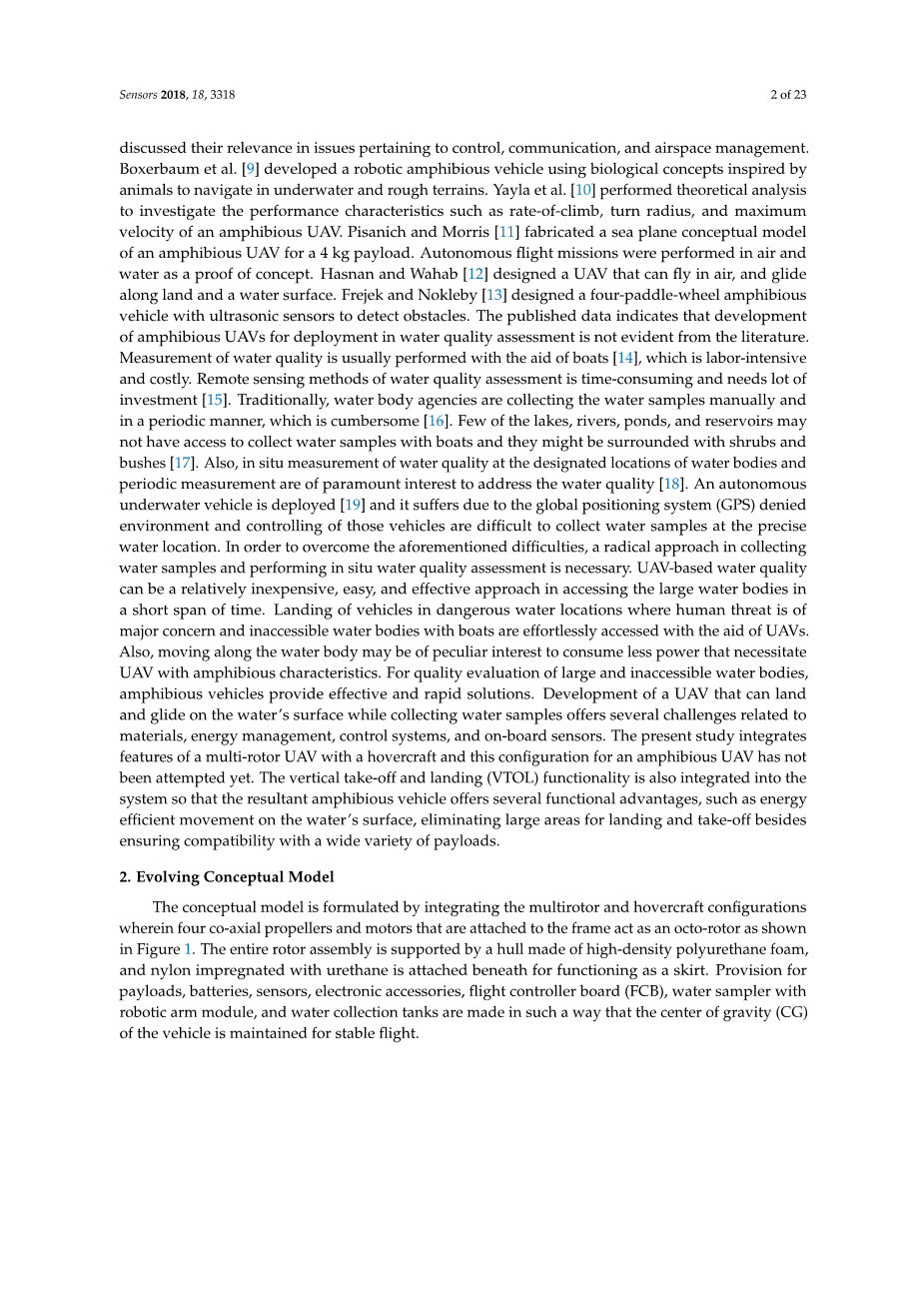 根据无人机(uav)机翼运动的性能特征,如固定翼、旋转翼和扑翼配置,对无人机进行了分类[1]。uav的各种应用包括监视、交通监视、主动武器交战、野生动物调查、污染监测、精确农业等[2]。本文作者参与了环境监测[3]无人机、结构健康监测[4]无人机的研制,并构建了微型飞行器[5-7]。在水陆两栖车辆的发展上,缺乏专门的研究。Collins[8]描述了两栖无人机在各种应用中的重要性,并讨论了它们在与控制、通信和空域管理相关的问题上的相关性。Boxerbaum等人[9],开发了一种利用生物概念的机器人两栖车辆,其灵感来自于动物在水下和崎岖地形中导航。Yayla等人对两栖无人机的爬升速度、转弯半径、最大速度等性能特性进行了理论分析。Pisanich和Morris[11]制作了一个海平面概念模型,用于4公斤负载的两栖无人机在空中和水中执行自主飞行任务作为概念的证明。Hasnan和Wahab[12]设计了一种无人机,可以在空中飞行,并沿着陆地和水面滑行。Frejek和Nokleby[13]设计了一种带有超声波传感器的四桨轮两栖车辆来探测障碍物。然而根据已发表的数据表明,在水质评估中部署两栖无人机的发展并不明显。水质测量通常是借助船[14]进行的,这是劳动密集型和昂贵的。遥感水质评价方法费时费力,需要大量的投资。传统上,水体机构采用人工定期采集水样的方式是一种繁琐的方法[16]。很少有湖泊、河流、池塘和水库不能用船收集水样,它们可能被灌木和灌木丛所包围。此外,在指定的水体位置进行水质的现场测量和定期测量,对于解决水质是至关重要的[18]。自主式水下机器人的部署,由于全球定位系统(GPS)无法提供环境,且无法对其进行控制,难以在精确的水下位置采集水样[19]。为克服上述困难,有必要从根本上收集水样和进行现场水质评价。基于无人机的水质可以是一种相对便宜、简单和有效的方法,可以在短时间内访问大型水体。车辆在对人类构成重大威胁的危险水域着陆,并且在无人驾驶飞机的帮助下,可以毫不费力地进入船只无法进入的水域。此外,沿着水体移动可能具有特殊的兴趣,以消耗更少的动力,这就需要具有两栖特性的无人机。水陆两栖车辆为大型不可接近水体的质量评价提供了有效、快速的解决方案。开发一种无人机,可以在收集水样的同时在水面着陆和滑翔,这对材料、能源管理、控制系统和机载传感器提出了几个挑战。本研究将多旋翼无人机的特点与气垫船结合起来,而这种两栖无人机的结构还没有尝试过。垂直起降(VTOL)功能也被集成到系统中,从而产生的两栖车辆提供了几个功能优势,例如在水面上的节能运动,除了确保与多种有效载荷兼容外,还消除了大面积的起降区域。