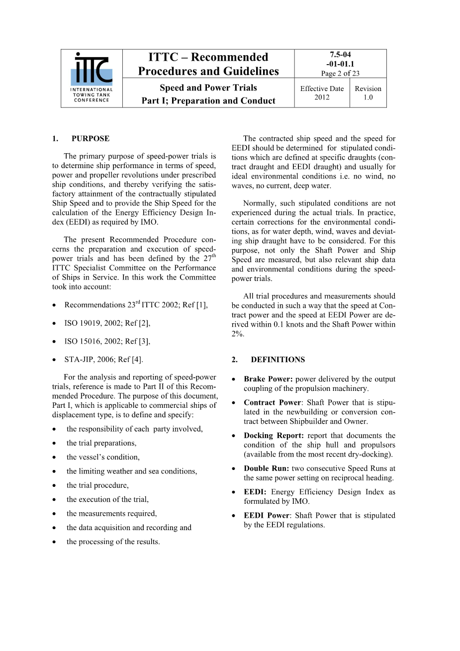 For the analysis and reporting of speed-power trials, reference is made to Part II of this Recommended Procedure. The purpose of this document Part I which is applicable to commercial ships of displacement type, is to define and specify: