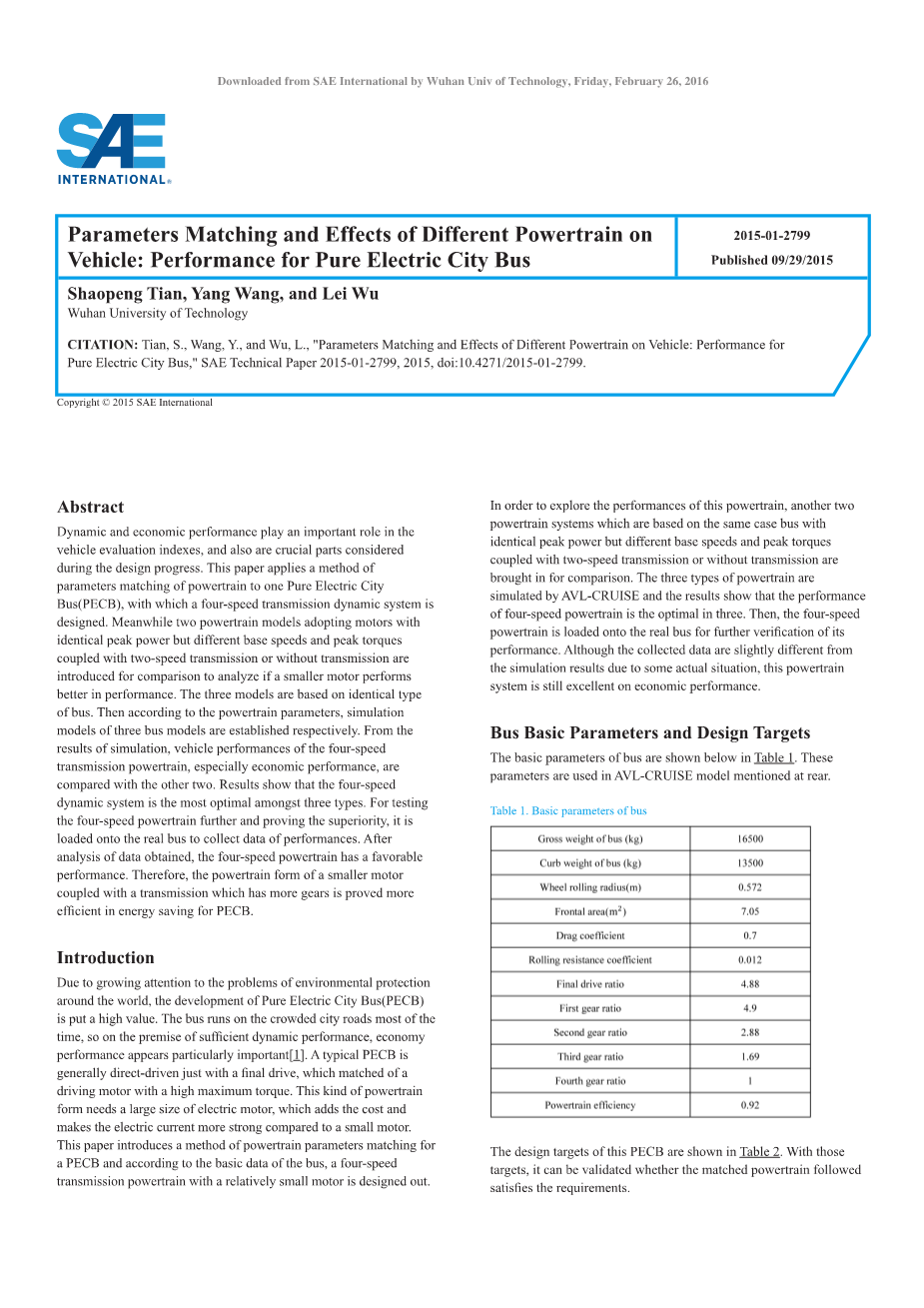 由于对全球环保问题越来越重视,纯电动城市客车(PECB)的发展具有很高的价值。公交车大部分时间都在拥挤的城市道路上行驶,因此在充分动态性能的前提下,经济性能显得尤为重要[1]。典型的PECB通常由最终驱动器直接驱动,该驱动器与具有高最大扭矩的驱动电机相匹配。这种动力总成形式需要大尺寸的电动机,与小型电动机相比,这增加了成本并使电流更强。本文介绍了一种PECB动力总成参数匹配方法,并根据总线的基本数据,设计了一种电机相对较小的四速变速器动力总成。为了探索这种动力传动系统的性能,另外两个动力传动系统基于相同的壳体总线,具有相同的峰值功率,但采用不同的基本速度和峰值扭矩与双速变速器或无变速器相结合,以此来用于比较。通过AVL-CRUISE对这三种动力总成进行了仿真,结果表明四速动力总成的性能是三者中最优的。然后,将四速动力传动系统加载到实际总线上,以进一步验证其性能。虽然由于某些实际情况,所收集的数据与模拟结果略有不同,但该动力总成系统在经济性能方面仍然是优秀的。