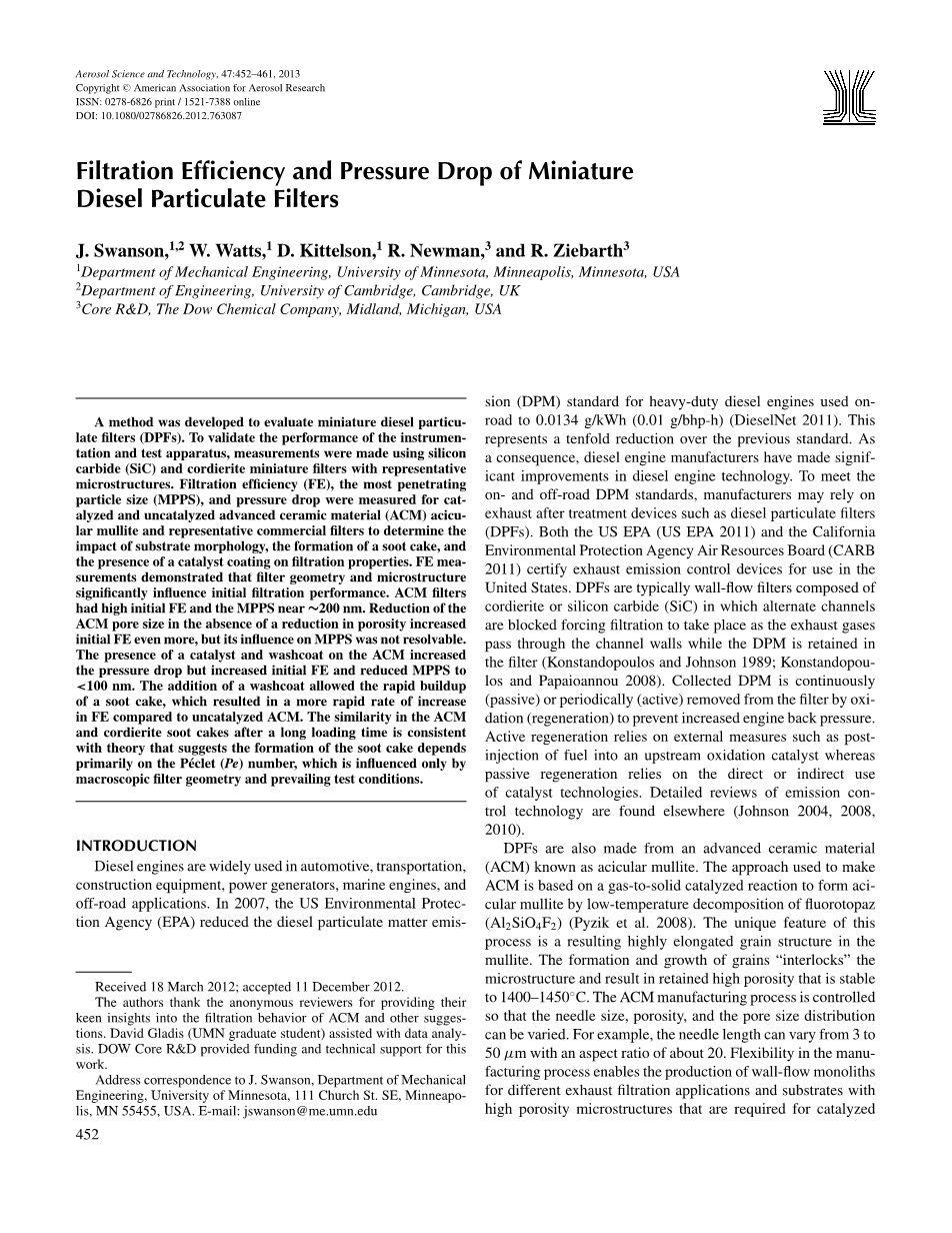 本文开发了一种评估微型柴油颗粒捕集器(DPFs)的方法。分别对碳化硅(SiC)微型DPF与具有代表性微结构的堇青石微型DPF进行测量以验证仪器和试验设备的性能。本文测量了已催化的和未催化的高级陶瓷材料(ACM)-针状莫来石和常用的商用过滤器的过滤效率(FE)、最大穿透粒径(MPPS)和压降,来确定基质形态、PM层的形成及催化剂涂层对过滤性能的影响。这个试验证明了过滤器的几何结构与微观结构显著地影响了过滤层的初始过滤性能。ACM颗粒捕集器有较高的初始过滤效率,且最大穿透粒径接近200纳米。在不减小孔隙率的情况下减小ACM孔径会使初始FE更加增加,但其对MPPS的影响无法解决。在ACM上的催化剂和活化涂层会增加压降但是也会增加初始过滤效率并且将最大穿透粒径减小到小于100纳米。添加涂层会使得PM层的快速形成,这导致了与未催化的ACM相比,催化ACM的过滤效率增长速率要更快。经过长时间的加载以后,ACM颗粒捕集器与堇青石颗粒捕集器过滤时的PM层形成的相似性与PM层的形成只取决于佩克莱数(Pe数)的理论相吻合,Pe数只由过滤器几何形状和当时的测试环境影响。