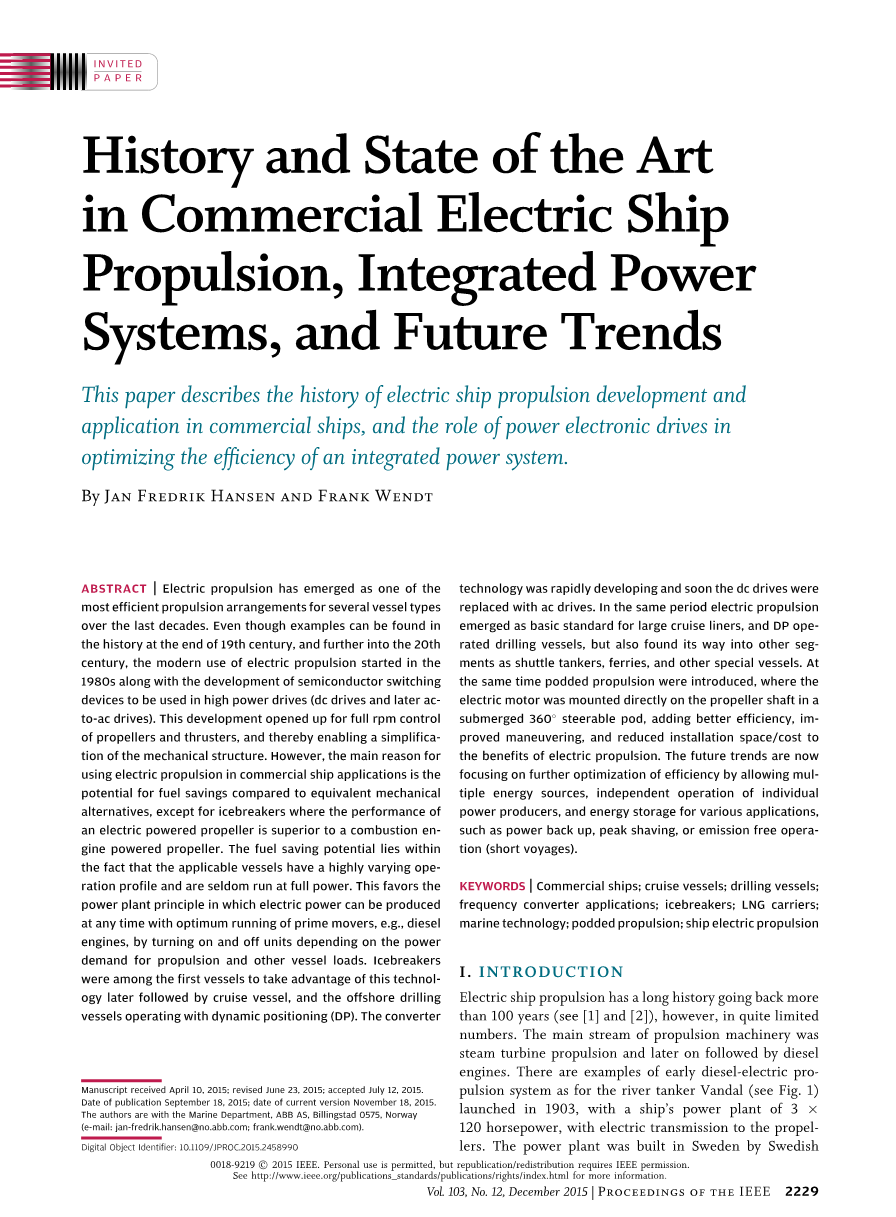 本文主要论述船舶电力推进技术的历史发展过程和该技术在商船上的应用,以及电力电子装置在提高综合电力系统效率方面所起的作用。
