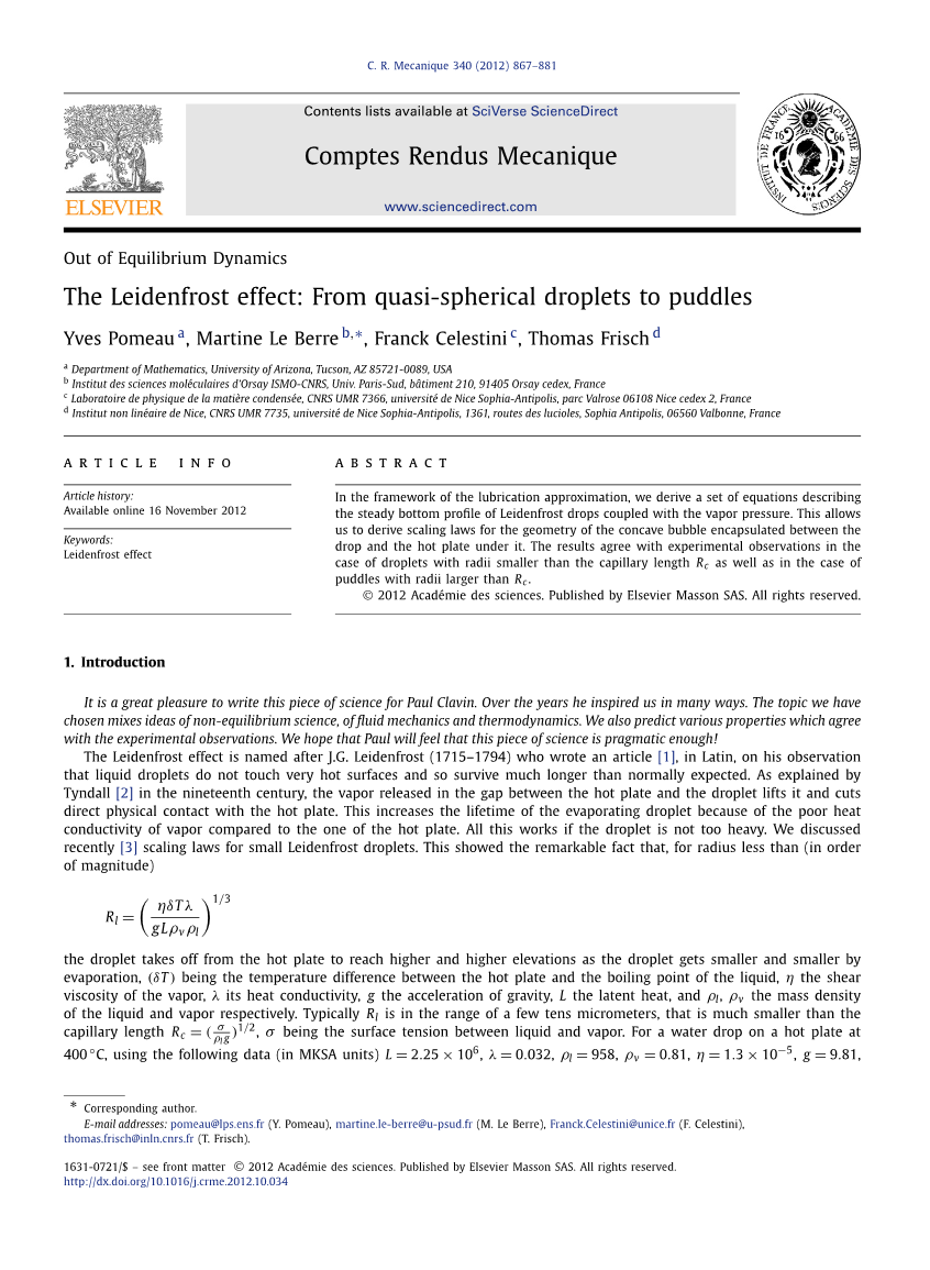 对比近期相同课题的文献[[4]][[5]],本次实验应该是最早通过讨论液滴与黏性蒸汽在液滴与热平面的间隙中的流动蒸发之中的共同点给出莱顿弗罗斯特效应作为物理量参数的评估的。这让我们对于本文的中心,,的标定更为重视。为了解决这类问题,我们第一次使用了方程(9),(17)和(19)。我们注意到在别的情况下观察相似的液滴形状已经被描述过了[5]。在后者情况下,液滴被多孔模型上的气流冲起。他们显示为一个孤立的气泡通过一段通道与外界相连的形式。在我们的结论中,流动是受缝隙中的蒸发与温度梯度影响的,不像[5]中是固定的,导致与其我们的结果不同。
