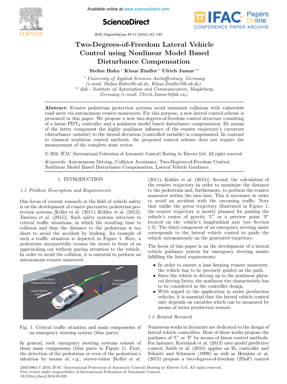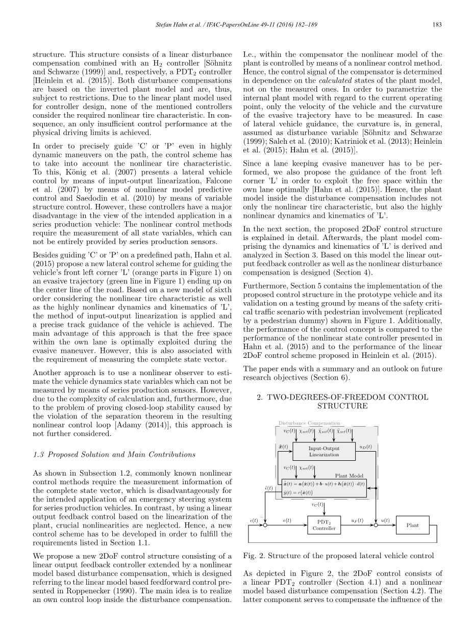 此外,第5节包含了提出了原型车及其控制结构的实施以及通过有行人参与的交通情景安全评估对试验场进行验证,如图1所示。此外,将控制概念的性能与Hahn(2015)等人中提出的非线性状态控制器的性能以及Heinlein(2015)等人提出的线性2DoF控制方案的性能进行了比较。
