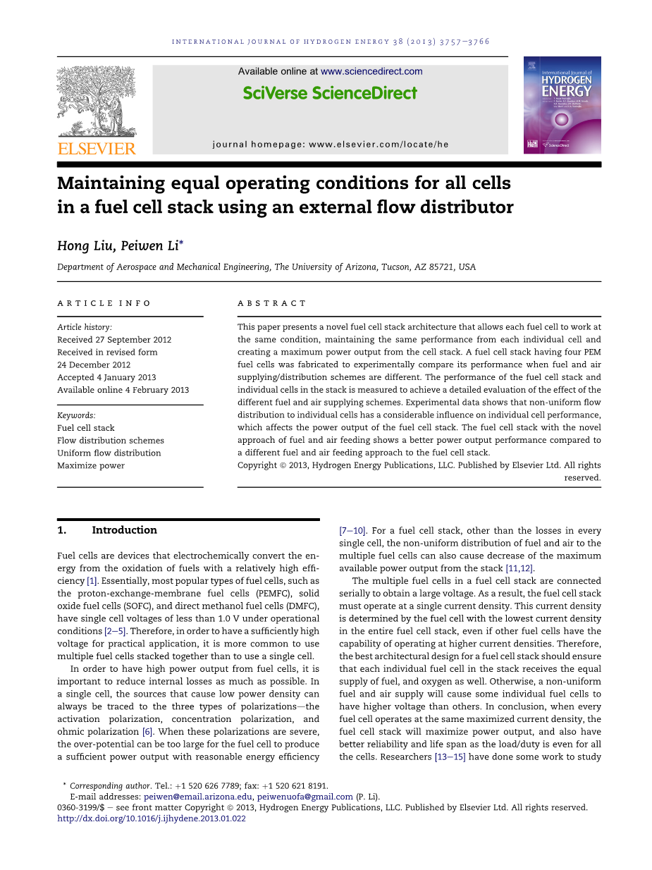 本文介绍了一种新型燃料电池堆架构,它允许每个燃料电池在相同条件下工作,保持每个单独电池的相同性能,并从电池堆产生最大功率输出。制造具有四个PEM燃料电池的燃料电池堆,以在燃料和空气供应/分配方案不同时通过实验比较其性能。测量燃料电池堆和堆中的各个电池的性能,以实现对不同燃料和空气供应方案的效果的详细评估。实验数据表明,对单个电池的不均匀流动分布对单个电池性能具有相当大的影响,这会影响燃料电池堆的功率输出。