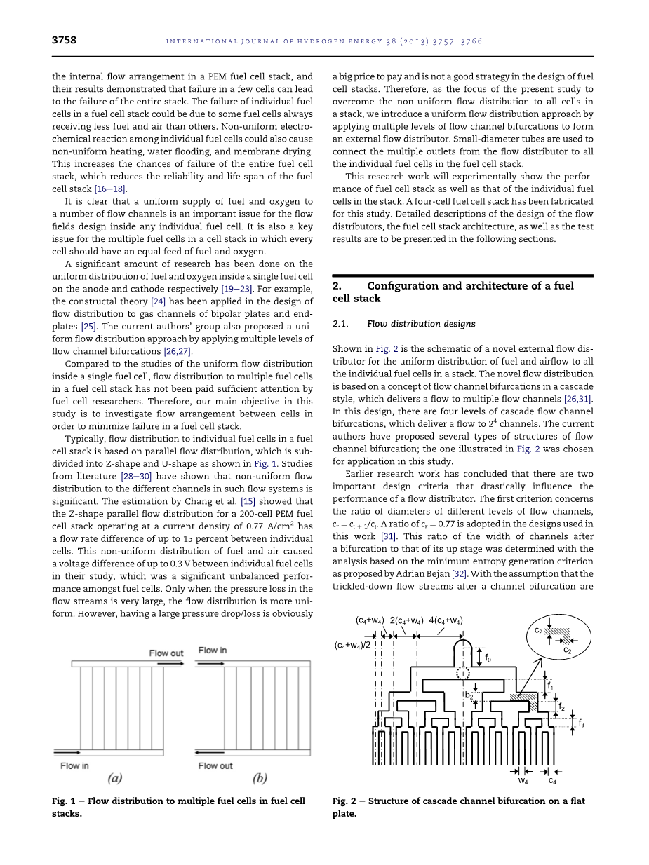对阳极和阴极上的单个燃料电池内的燃料和氧气的均匀分布进行了大量研究。例如,构造理论已应用于双极板和端板气体通道的流量分配设计。目前作者小组还提出了采用多级流道分岔的均匀流量分配方法。