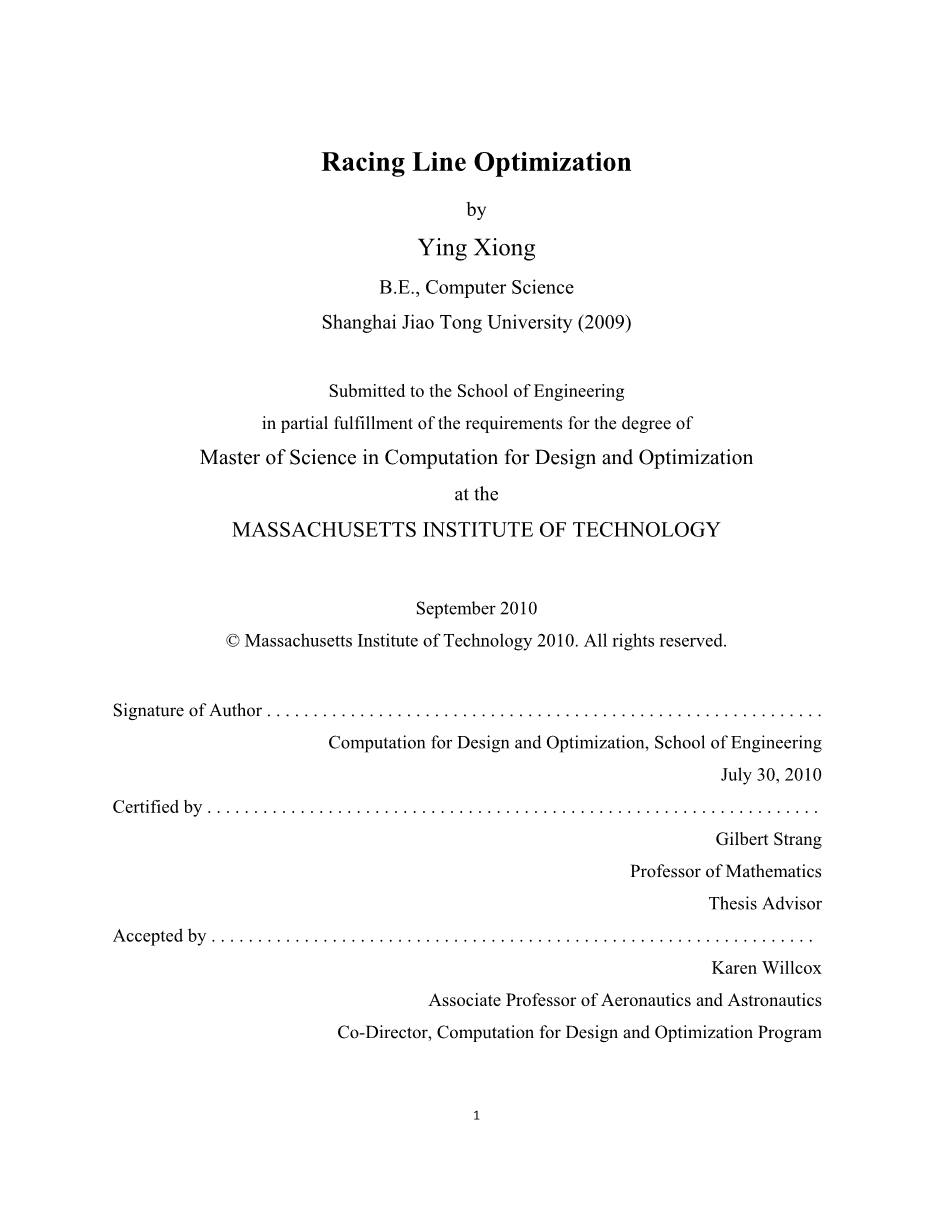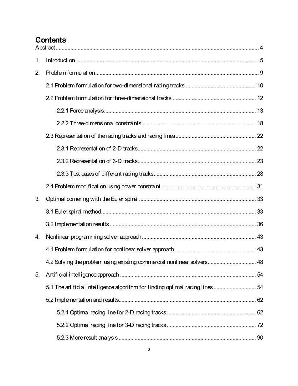 尽管大多数赛车手都擅长控制自己的赛车,但世界冠军在选择合适的赛车线方面总是很有天赋,而其他车手大多都没有这么做。最佳赛车选线是赛车运动中的一个关键问题。然而,目前它强烈地基于经验丰富的赛车手进行重复实时实验后的直觉。拥有一种能够根据给定的赛道和赛车产生最佳赛车线的方法将非常有用。本文阐述了四种生成最优赛车线的方法:欧拉螺旋法,人工智能法,非线性规划求解器法和综合法。首先,我们研究问题并获得二维和三维情况的目标函数和约束。研究了赛道的数学和物理特征。然后我们尝试不同的方法来解决这个复杂的非线性规划问题欧拉螺旋方法在拐角处产生欧拉螺旋曲线转弯,它可以快速准确地为没有银行的二维转角提供最佳结果。非线性编程求解器方法基于AMPL上的MINOS求解器和MATLAB优化工具箱,它只需要输入目标函数和约束。重点强调人工智能方法。它适用于任何2-D或3-D轨道形状。它采用智能算法,包括分支切割和前视,为2-D和3-D轨道提供最佳赛车线。并且该集成方法结合了方法及其优点,使其在所有情况下都快速且实用。比较了不同的方法,并详细描述了它们向最佳方向的演变。开发了便利的显示软件以显示用于观察的轨道和赛道线。寻找汽车最佳赛车线的方法也有助于找到自行车比赛,滑冰和滑雪的最佳赛车线。