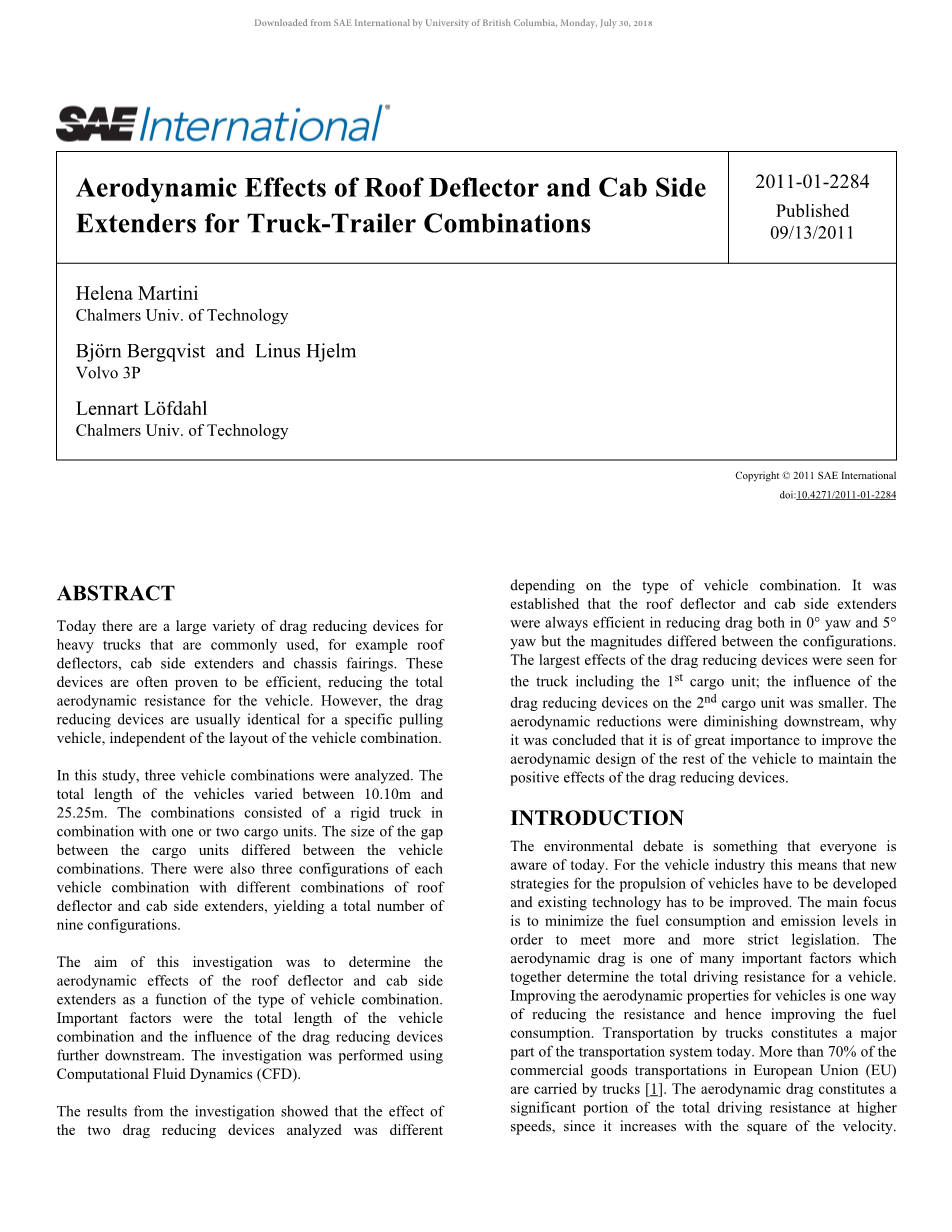 在这项研究中,分析了顶部导流罩和驾驶室侧导流罩对不同车辆组合的空气动力学效应。目的是确定这些空气动力装置的效率是否具有可比性。一个有趣的方面是在添加这些减阻装置时确定下游的影响。现在在沃尔沃卡车上,顶部导流罩和驾驶室侧导流罩对于给定的牵引车是相同的,其中一种配置用于刚性卡车,一种用于牵引车; 独立于车辆组合的拖车配置。由于当时许多卡车当时携带多个货物单元,因此这些减阻装置的性能非常重要,研究起来很有意思。