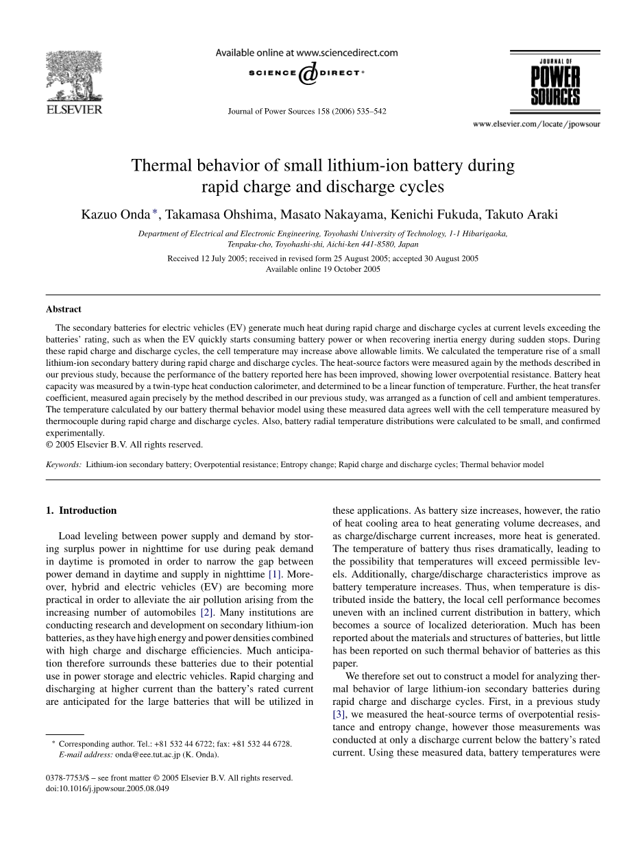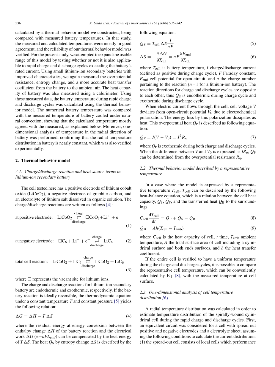 电动汽车的二次电池(EV)在快速充放电循环过程中产生大量的热量,电流水平超过电池的额定值,例如当电动汽车快速开始消耗电池电量时,或在突然停车时恢复惯性能量时。在这些快速的充放电循环中,可能使电池温度升高到允许的限度以上。我们计算了一个很小的温升锂离子二次电池的快速充放电周期。采用所述方法对热源因素进行了重新测定,我们之前的研究结果,显示出较低的过电位电阻,因此这里报道的电池的性能已经得到了改善,显示出较低的过电位电阻。电池热采用双传热式量热计测量了热容,并确定其为温度的线性函数。更进一步,热传递利用我们之前研究中描述的方法再次精确测量的系数被安排为细胞和环境温度的函数。用这些实测数据计算的电池热行为模型与所测得的电池温度在较好热电偶快速充放电周期吻合。同时,计算了电池径向温度分布较小,并进行了验证实验。